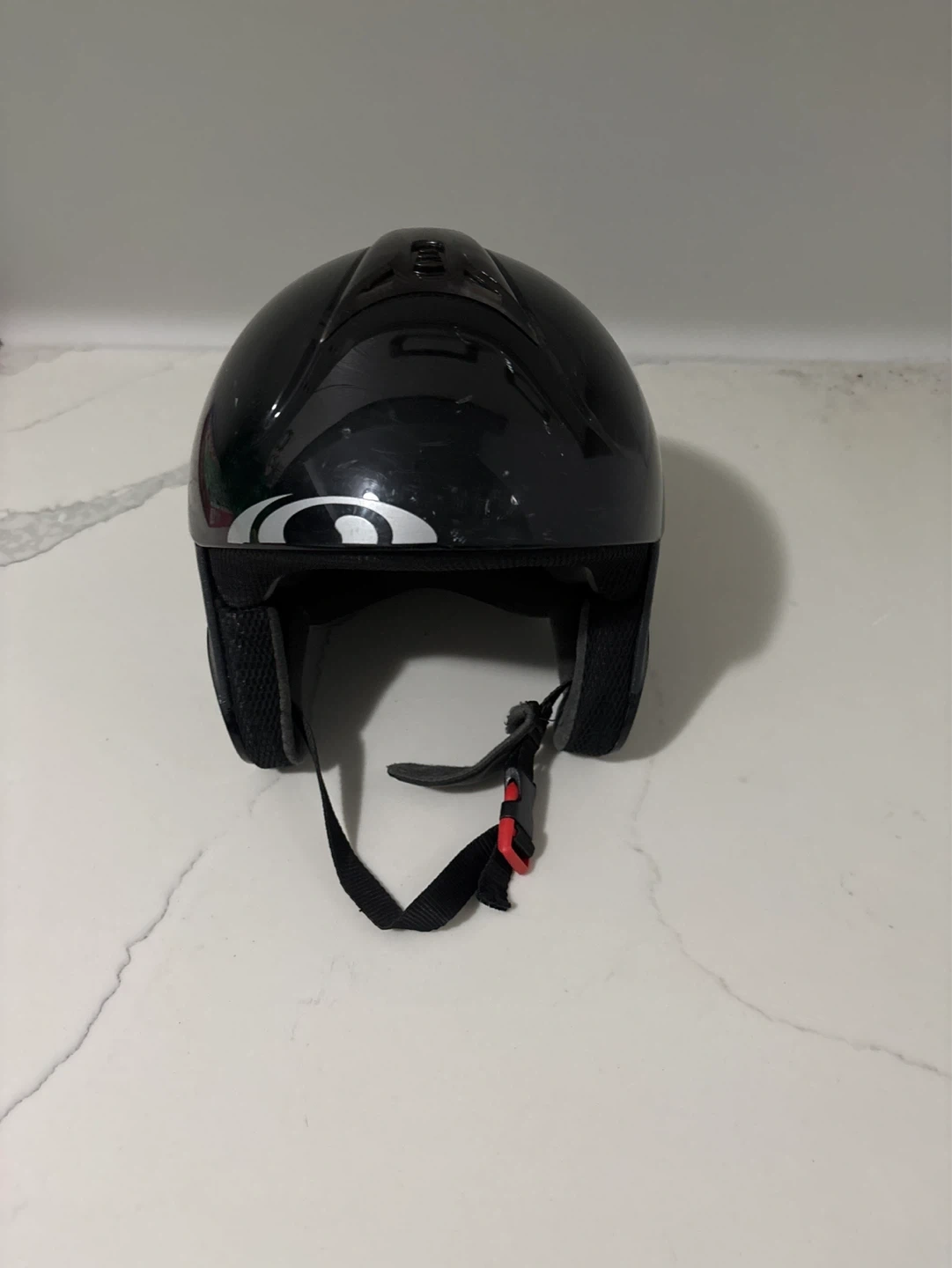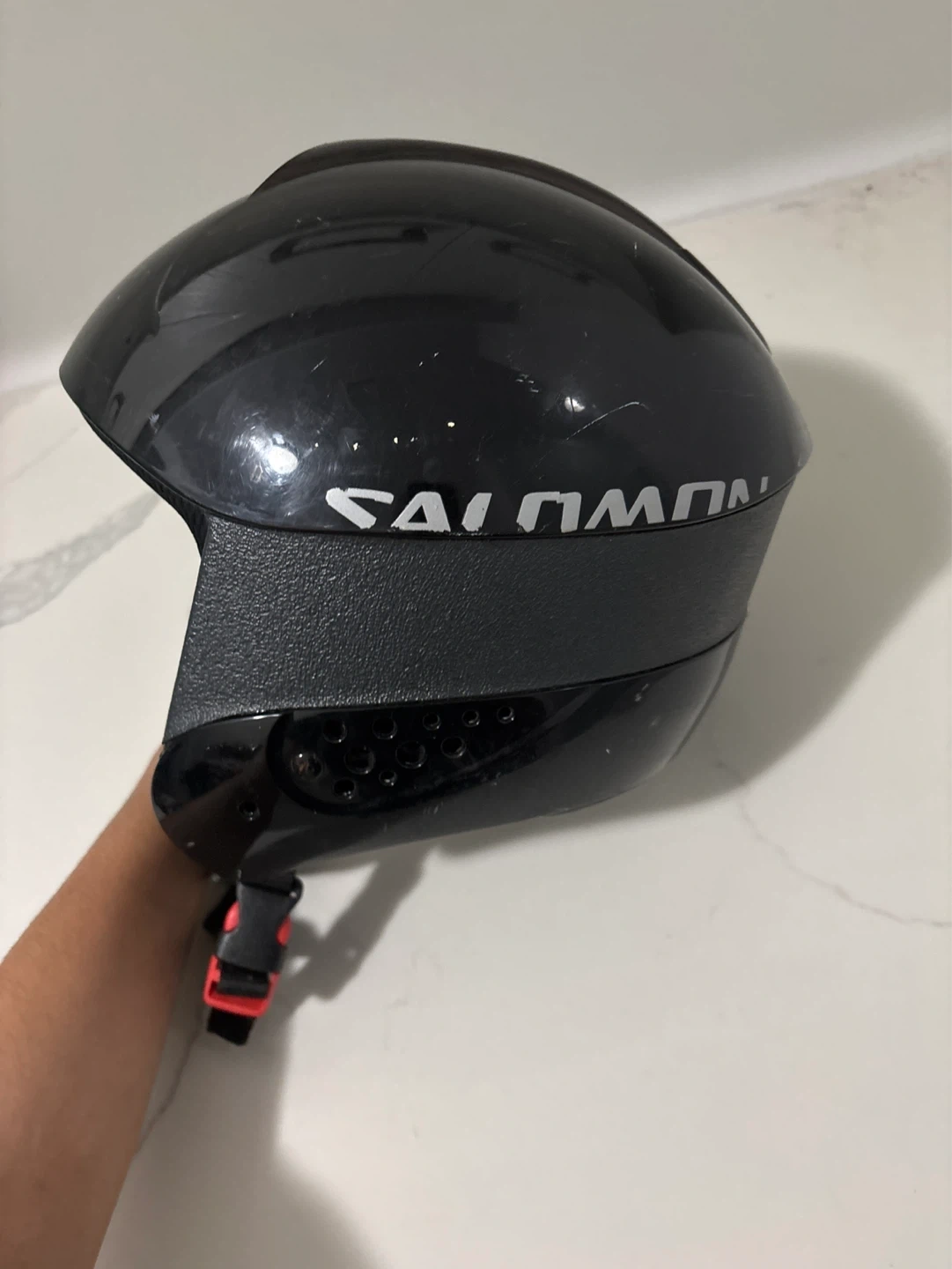 This is a black Salomon ski helmet. It has adjustable straps for a secure fit and a padded interior for comfort. Its shell is made from durable material.
