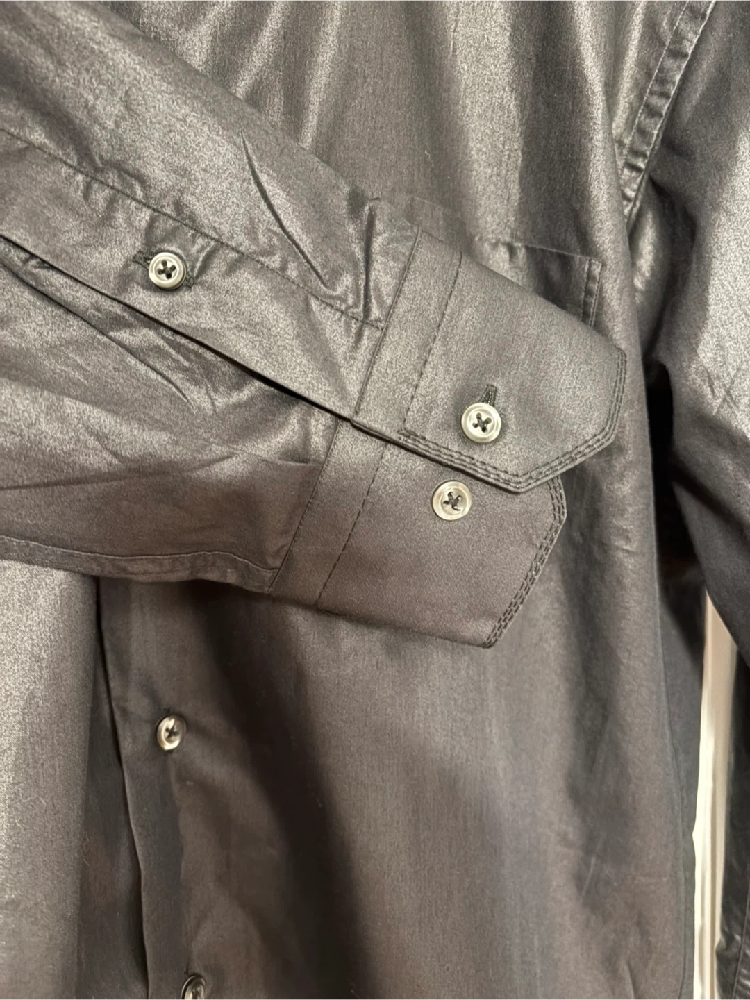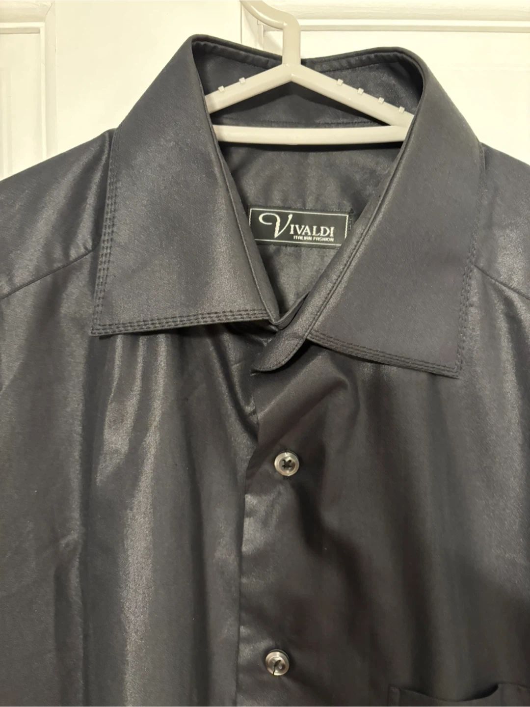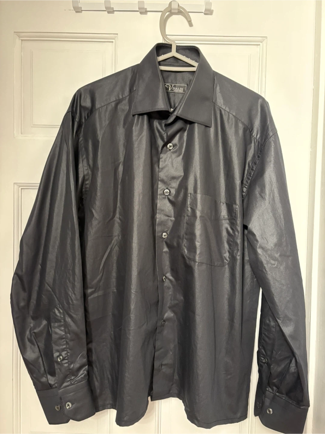 This is a Vivaldi men's black long sleeve dress shirt. It features a button-down front and a chest pocket. The material has a subtle sheen. Perfect for dressing up an outfit!