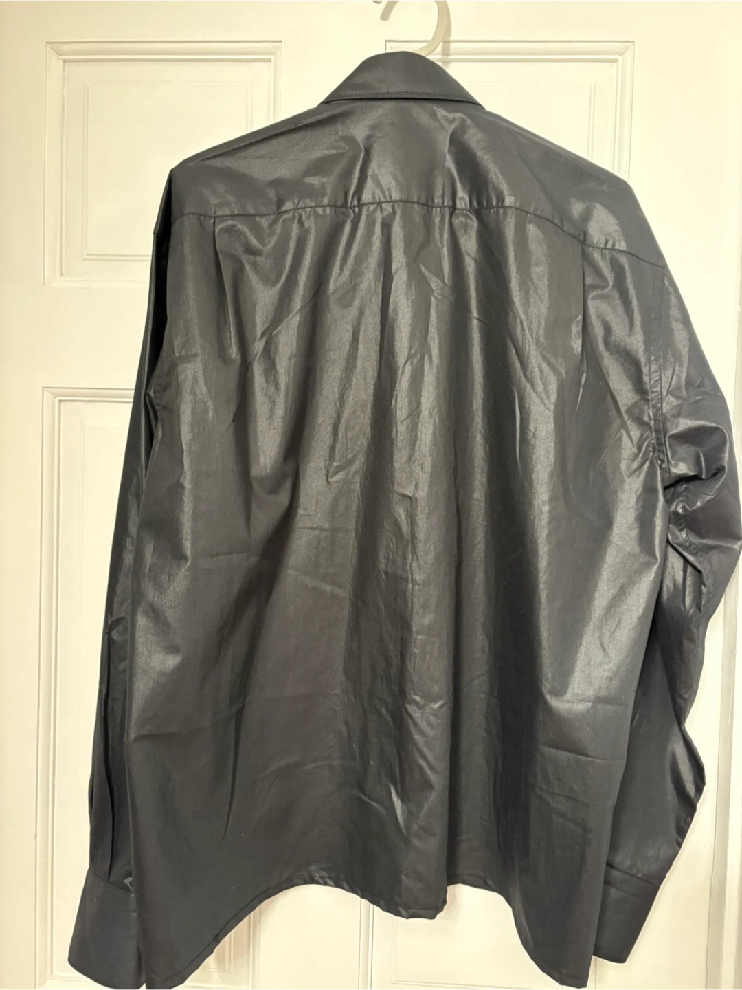 This is a Vivaldi men's black long sleeve dress shirt. It features a button-down front and a chest pocket. The material has a subtle sheen. Perfect for dressing up an outfit!