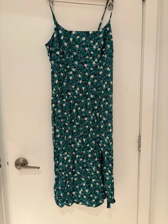This adorable Uniqlo dress features a stylish green floral pattern, perfect for any casual occasion! It's a size large and has only been worn once. Love the straps and leg slit! Pick up at King and Portland. Cash only