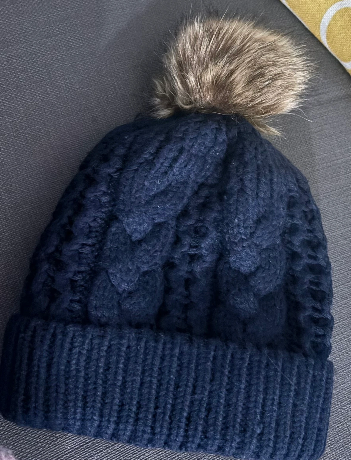 Navy Blue Cable Knit Beanie with Faux Fur Pom Pom
