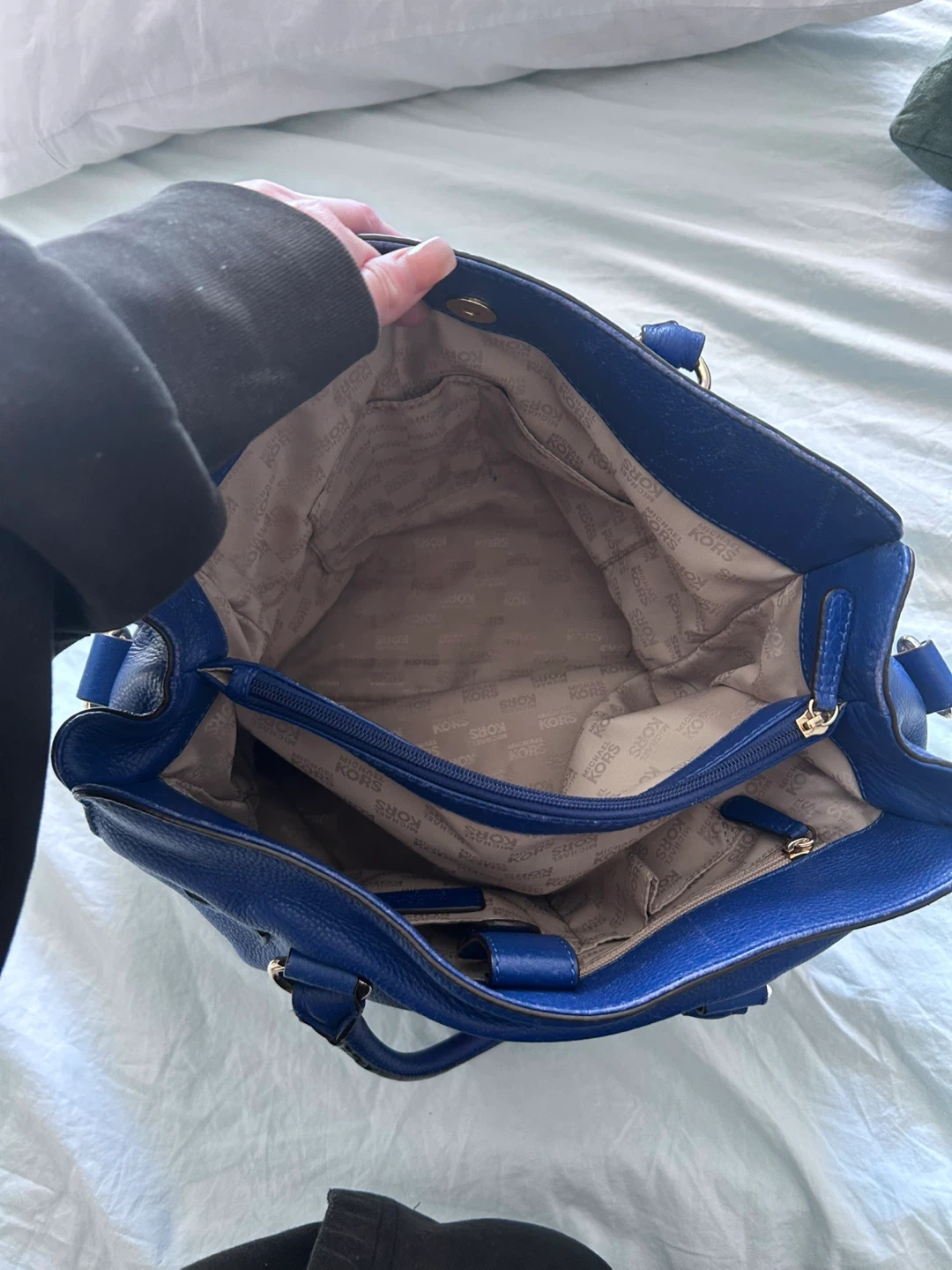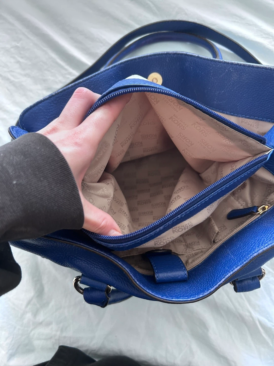 This is a Michael Kors leather satchel handbag in a vibrant royal blue colour. It features top handles and a detachable shoulder strap for versatile wear. The interior has multiple compartments, including a zippered section, to help you stay organized.