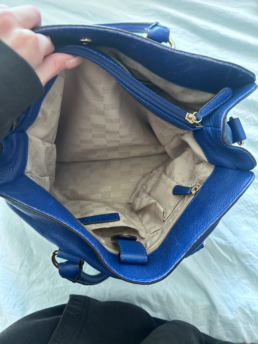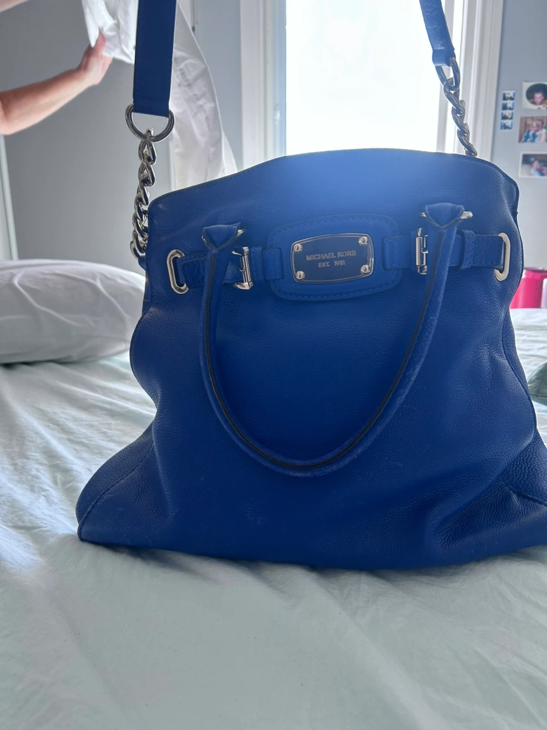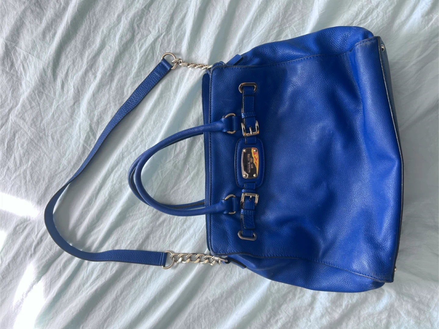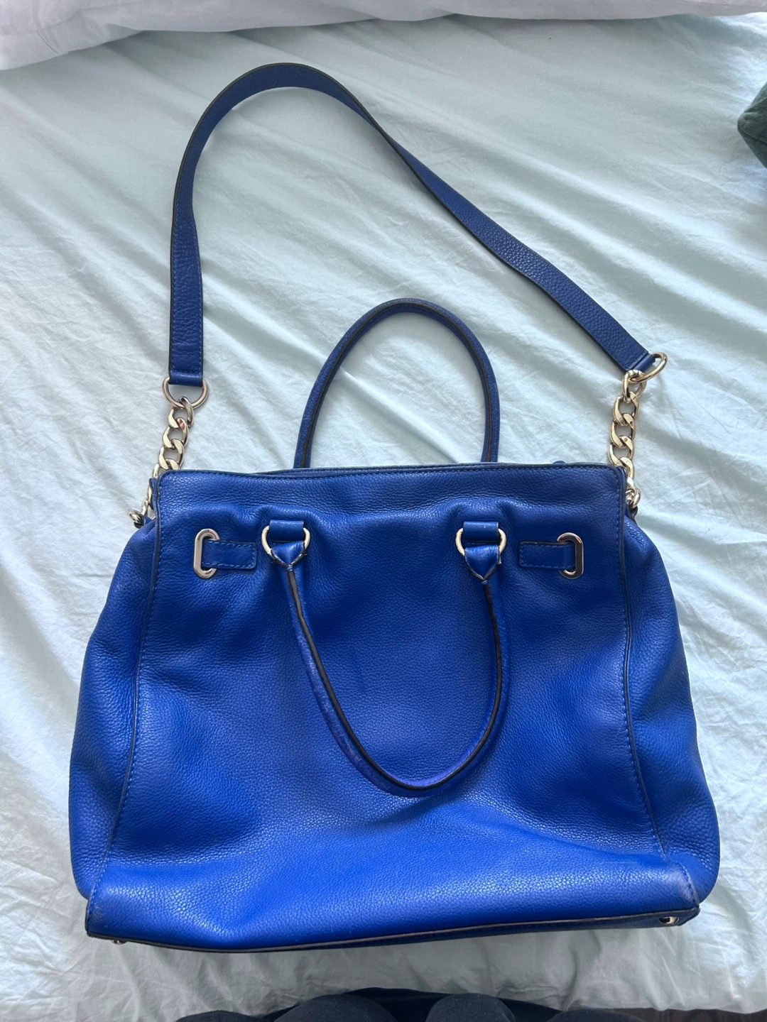 This is a Michael Kors leather satchel handbag in a vibrant royal blue colour. It features top handles and a detachable shoulder strap for versatile wear. The interior has multiple compartments, including a zippered section, to help you stay organized.