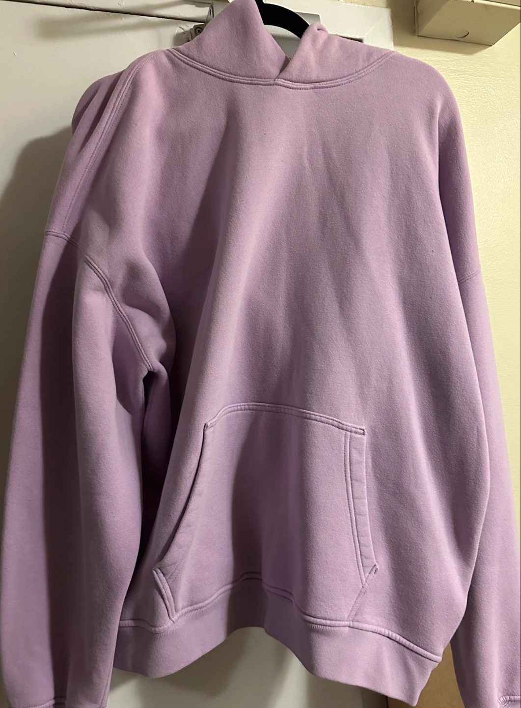 Lavender oversized hoodie. Soft and comfortable. Features a kangaroo pocket and drawstring hood.