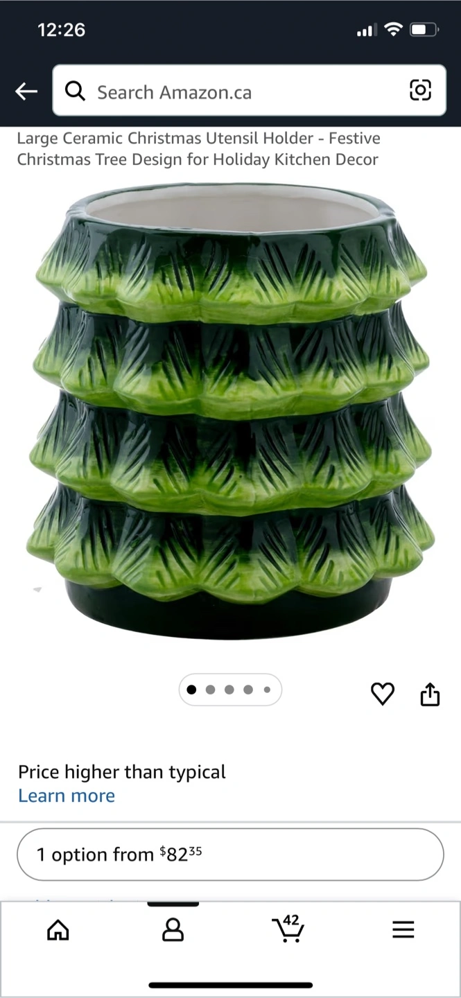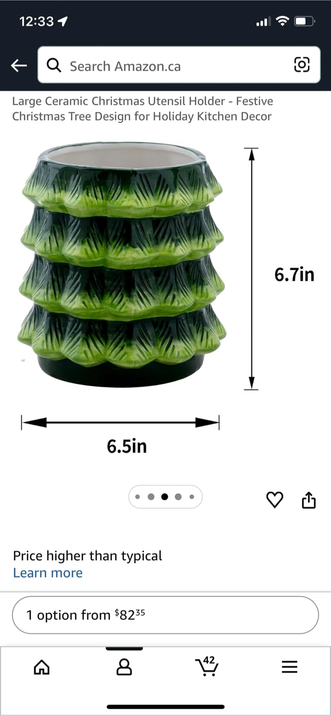 This festive ceramic utensil holder is shaped like a Christmas tree. It measures 6.5 inches wide and 6.7 inches tall. Great for holiday kitchen decor!