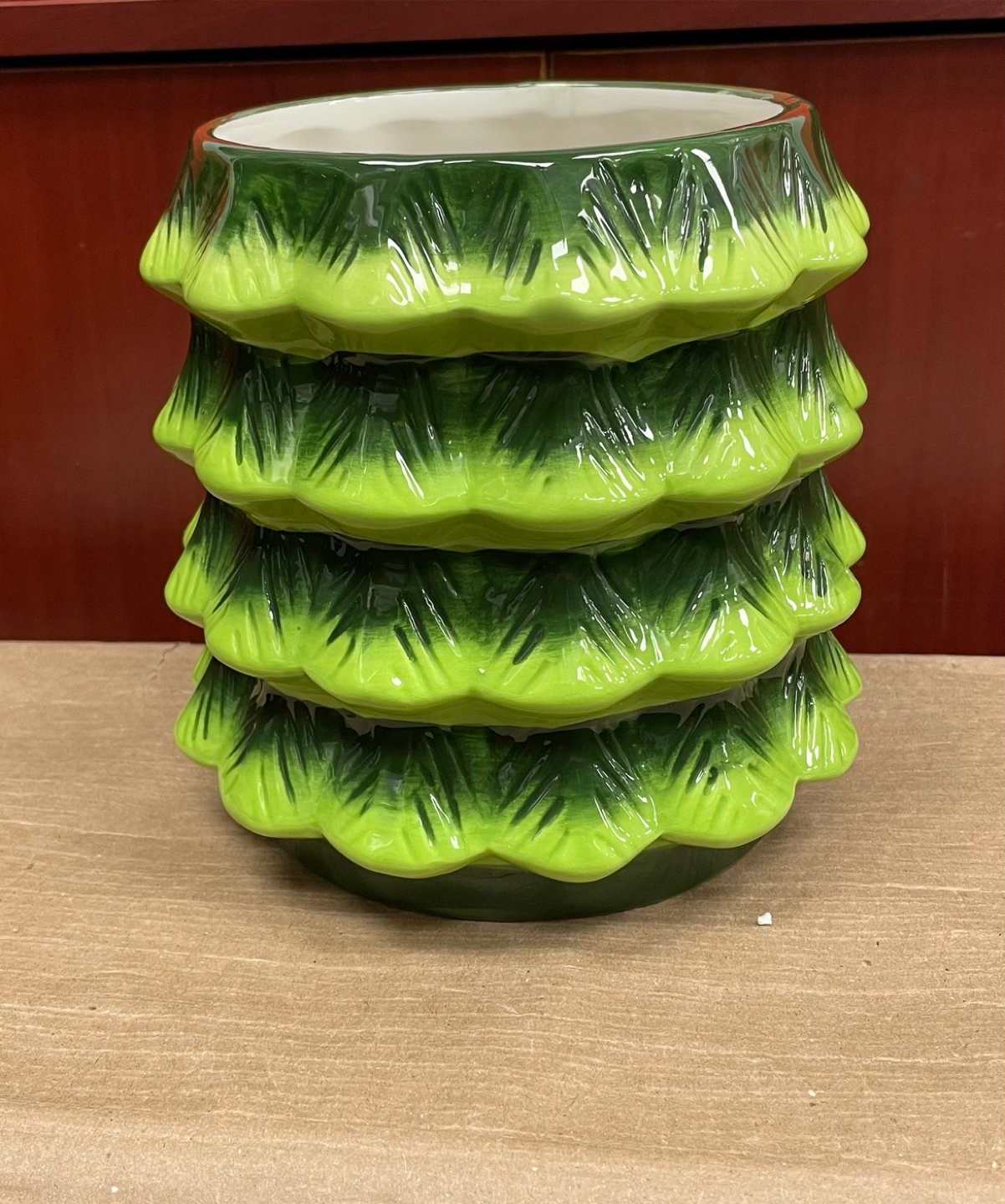 This festive ceramic utensil holder is shaped like a Christmas tree. It measures 6.5 inches wide and 6.7 inches tall. Great for holiday kitchen decor!
