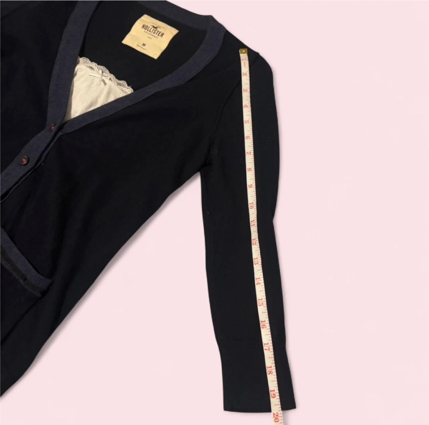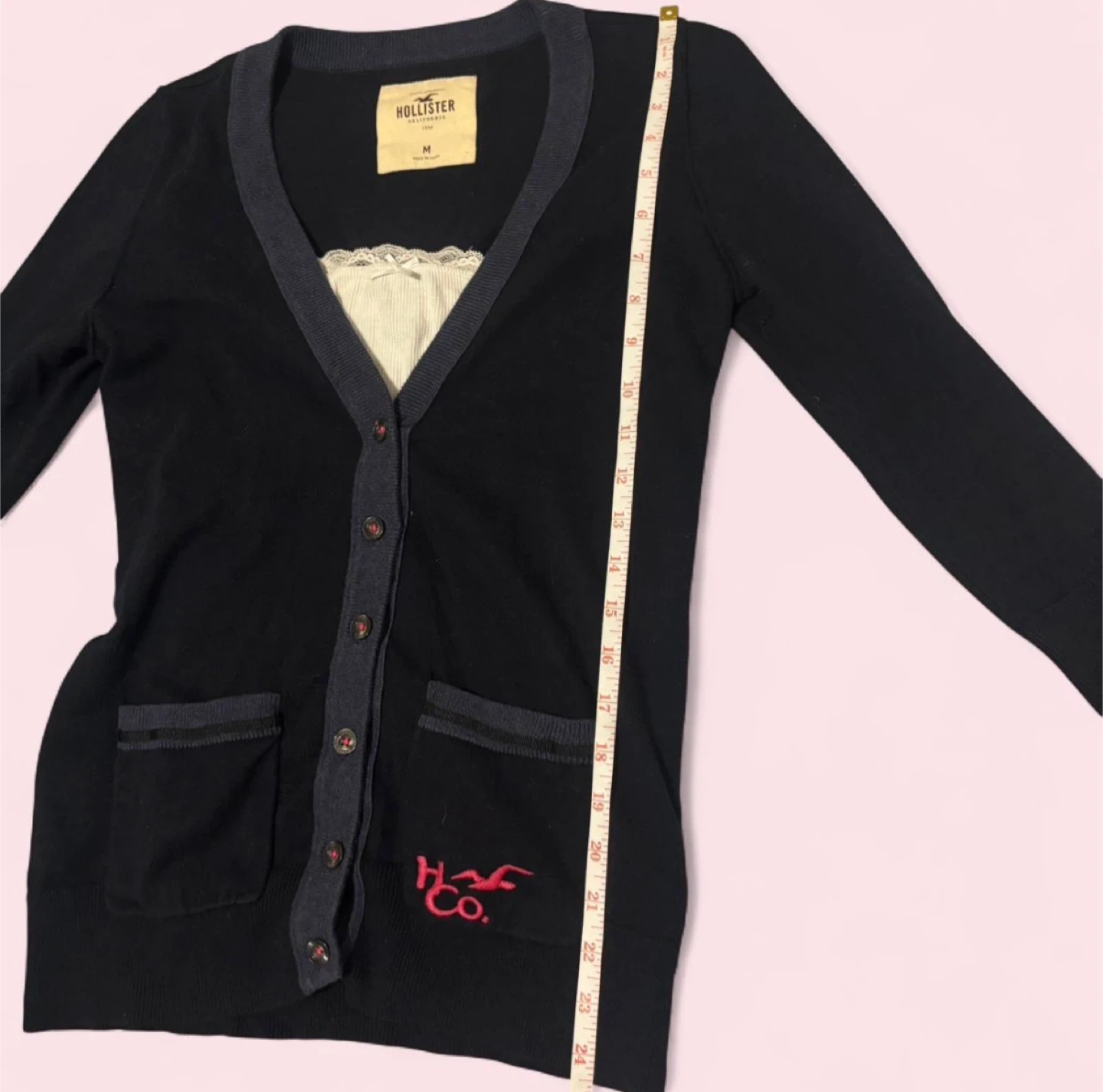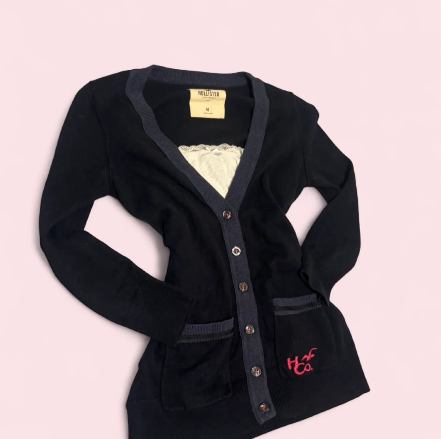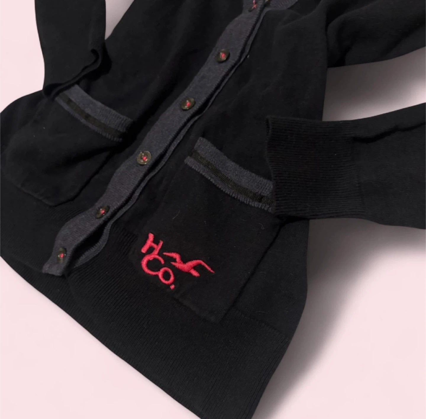 This is a Hollister brand black cardigan. It's a size medium with a pink embroidered logo on the pocket. This cardigan is perfect for layering on cooler days! #fall #2000s#fashion #hollister
