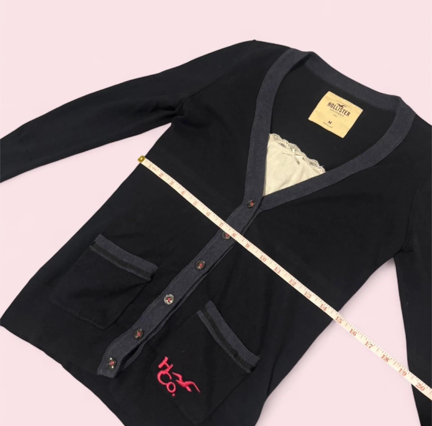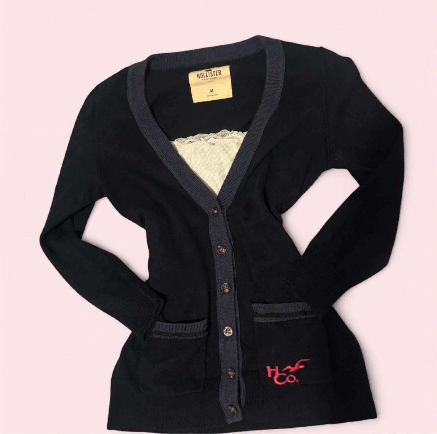 This is a Hollister brand black cardigan. It's a size medium with a pink embroidered logo on the pocket. This cardigan is perfect for layering on cooler days! #fall #2000s#fashion #hollister