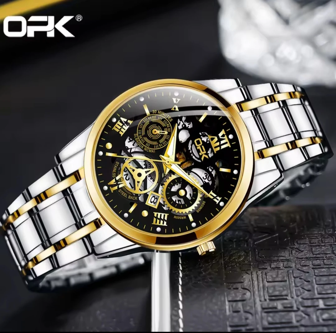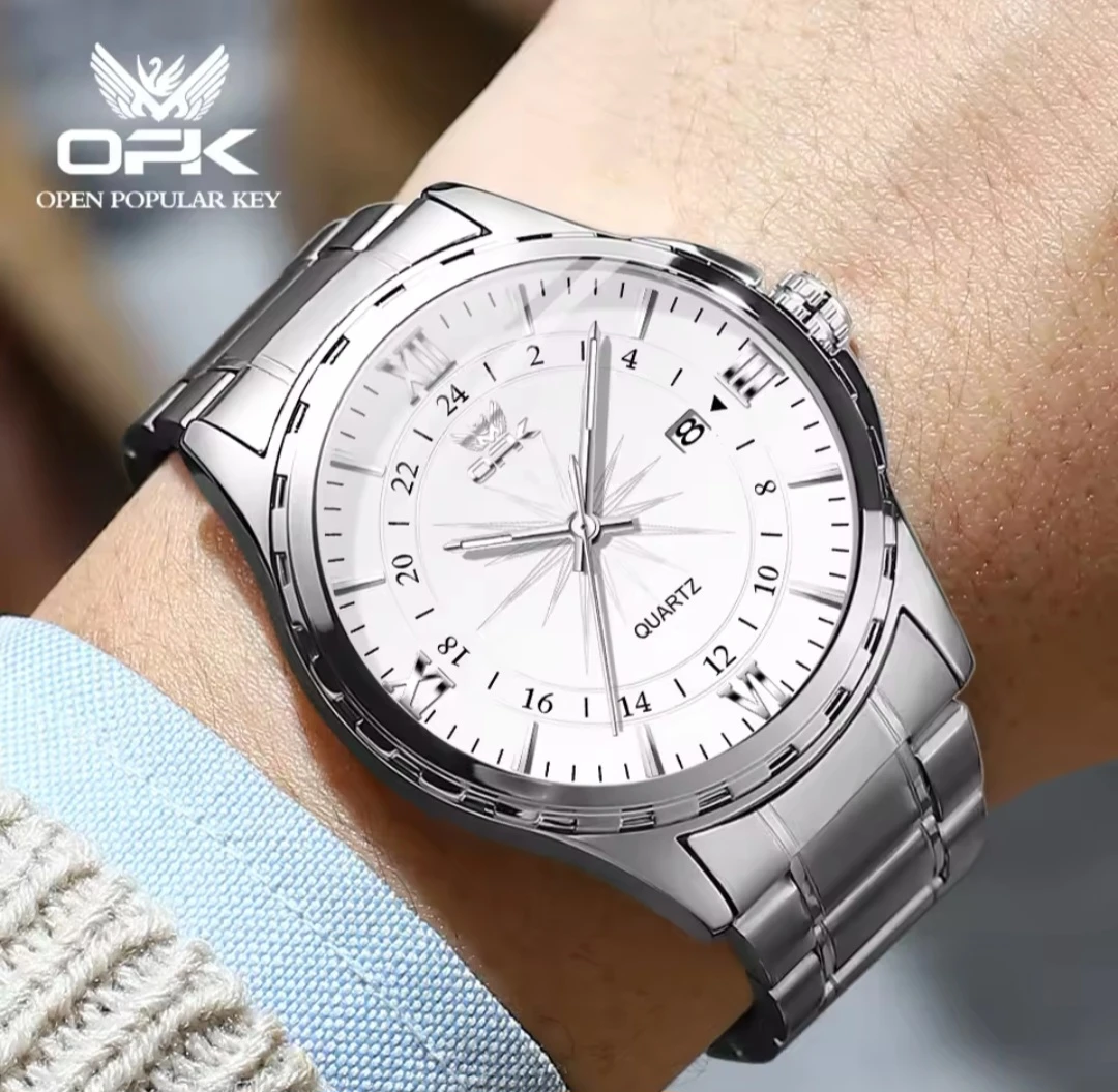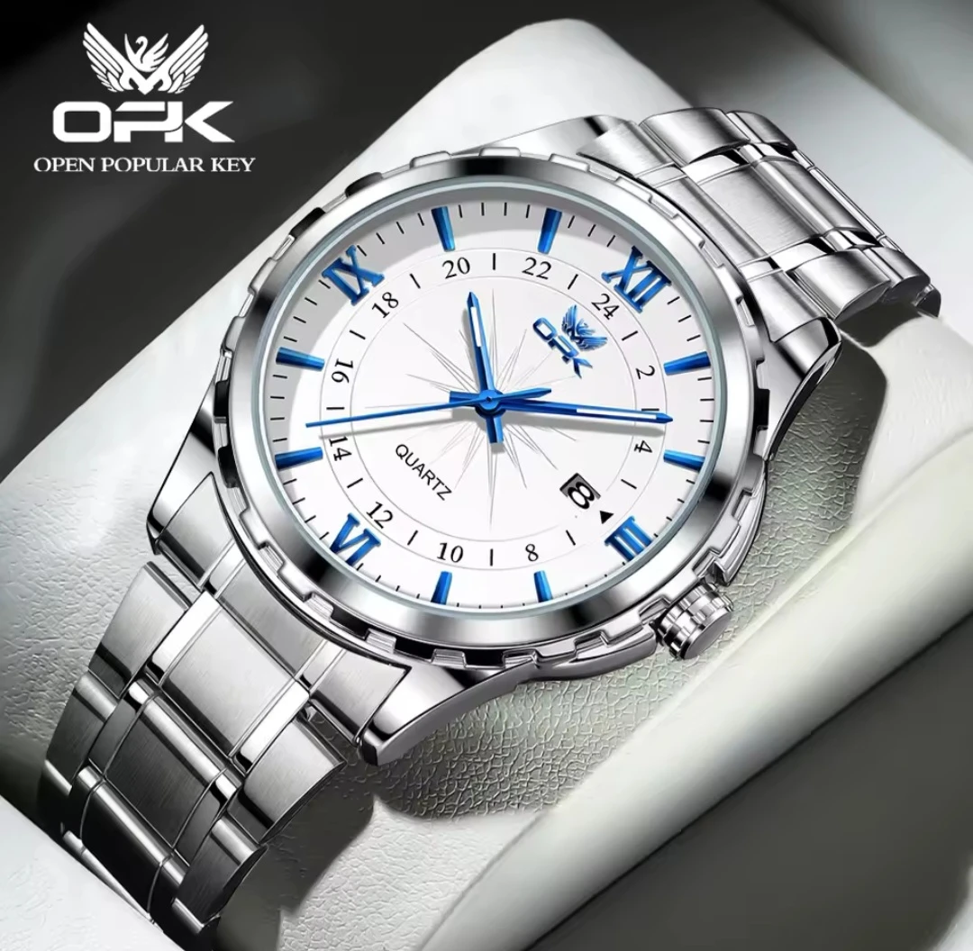 This OPK Quartz watch features a durable stainless steel band and a classic white dial. It includes a date display complication for added functionality. Its reliable quartz movement ensures accurate timekeeping for everyday wear.