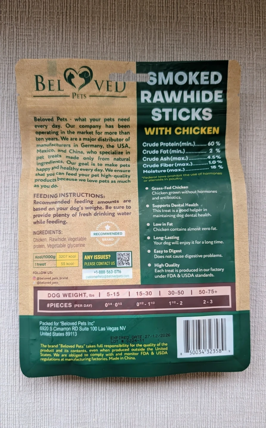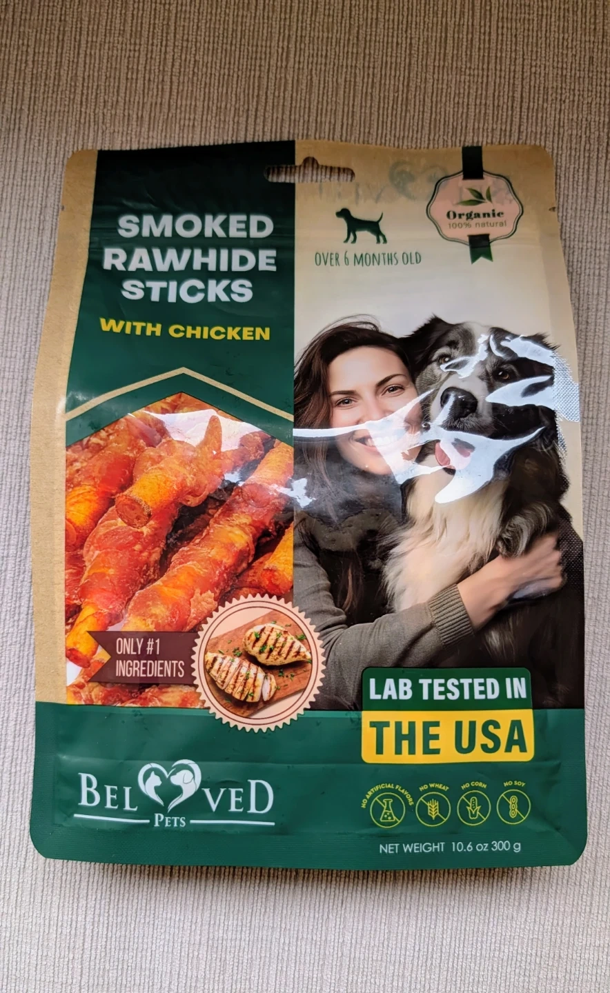 Beloved Pets smoked rawhide sticks with chicken are made from organic ingredients. They are lab tested in the USA and contain no artificial flavours, wheat, or corn. These long-lasting chews are great for dental health. Expired date 27/12/2026.