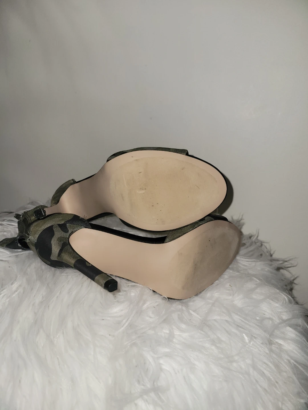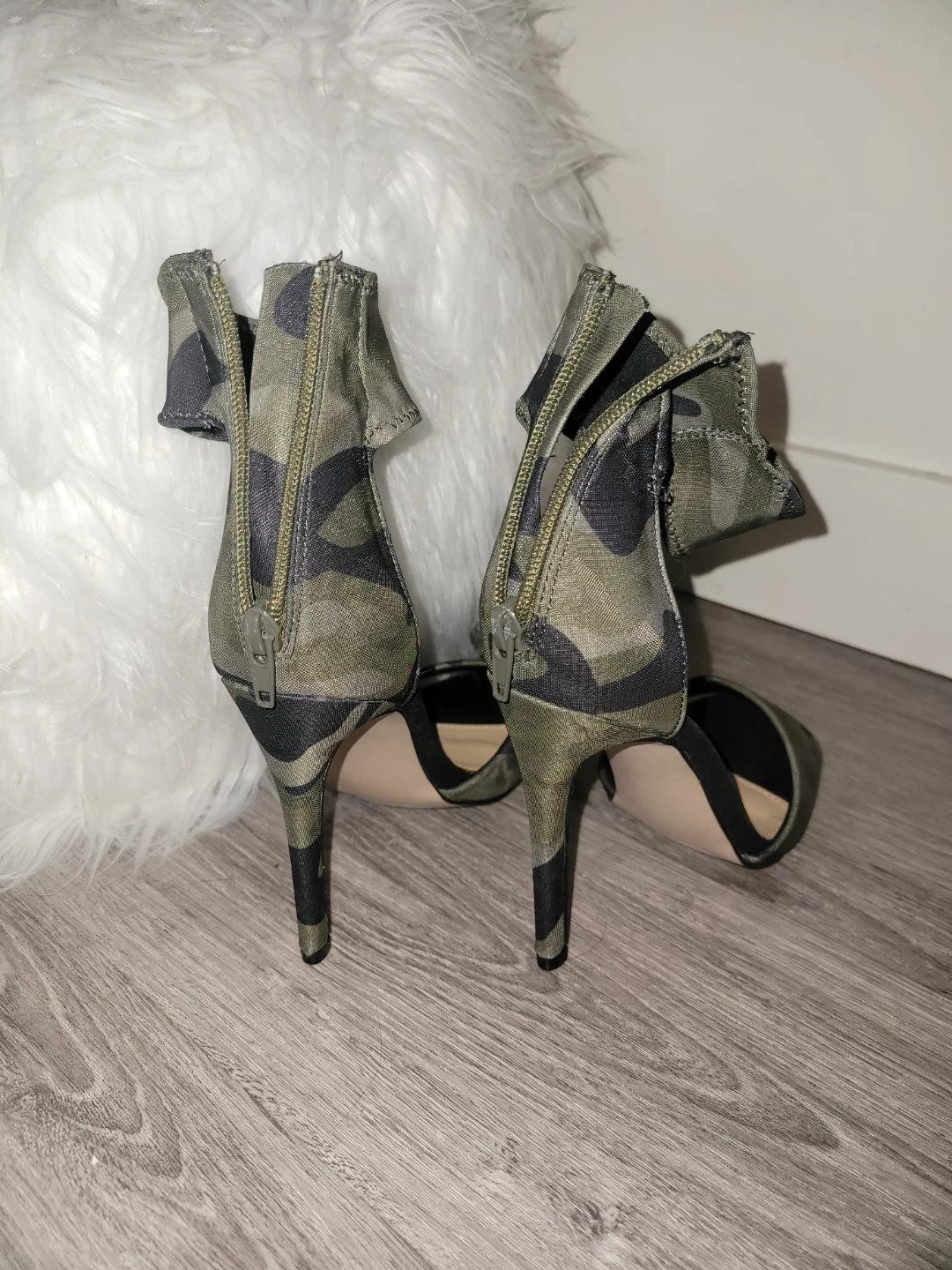 Stylish camo print open toed sandal heels from Shoedazzle. These feature a zipper closure and a Man Made upper and outsole.