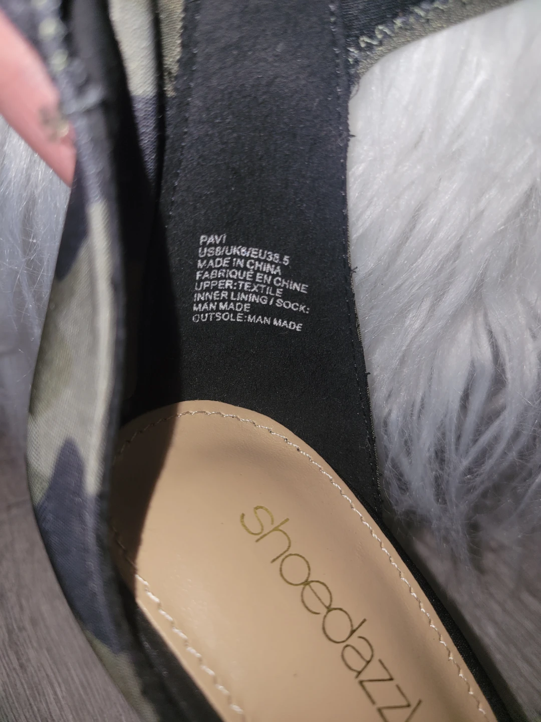 Stylish camo print open toed sandal heels from Shoedazzle. These feature a zipper closure and a Man Made upper and outsole.