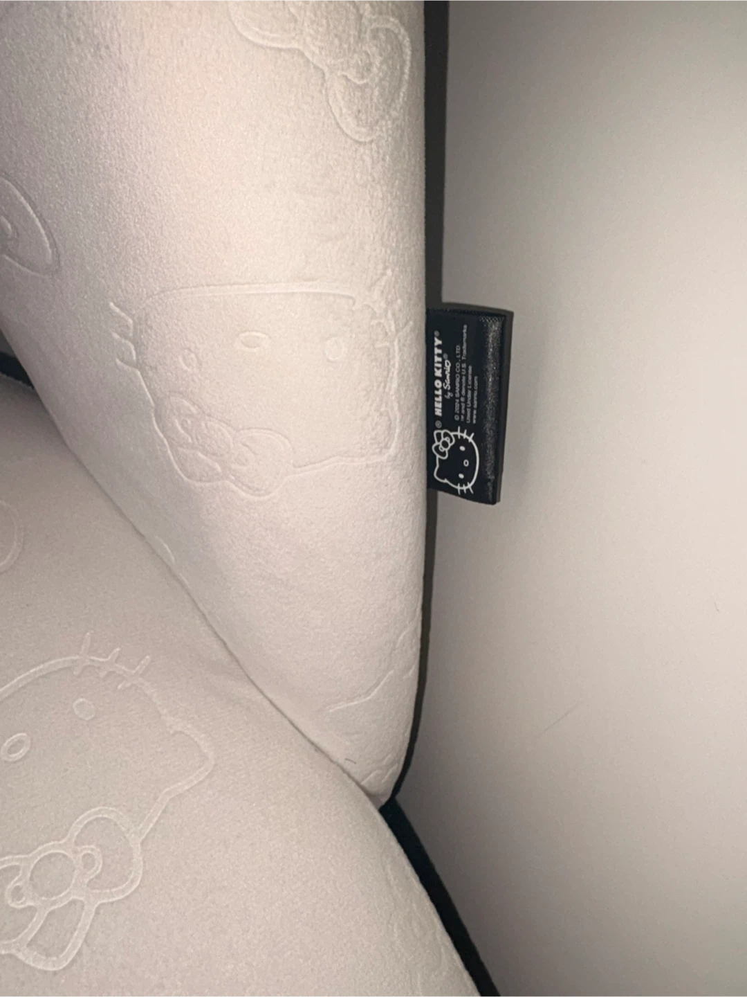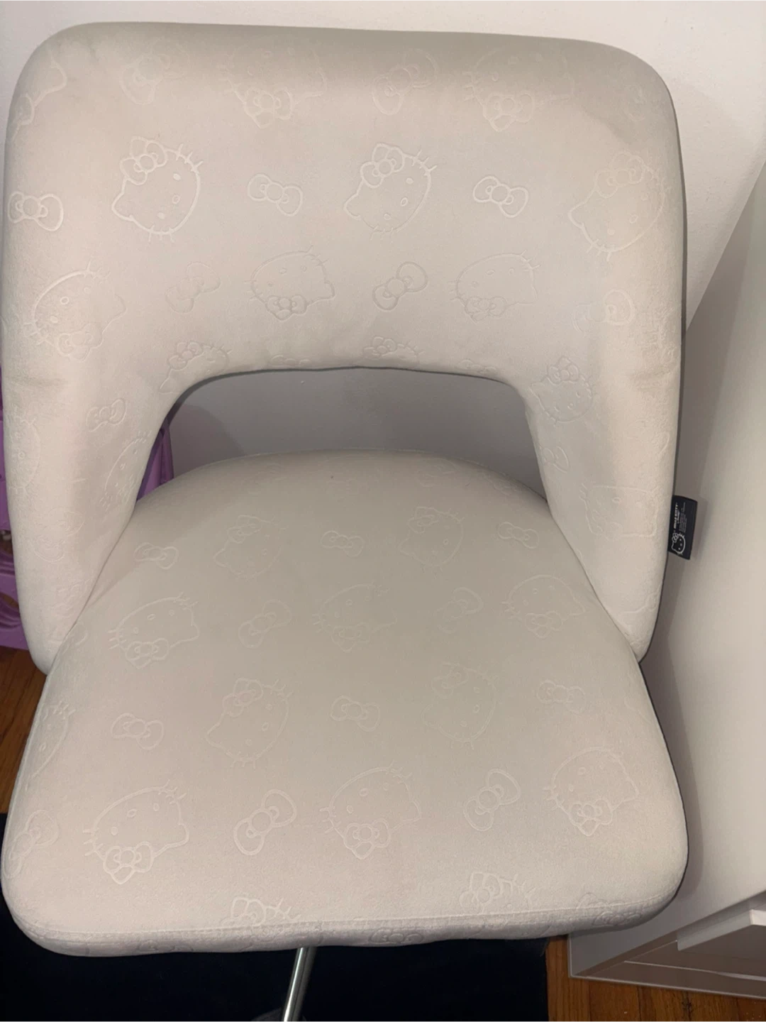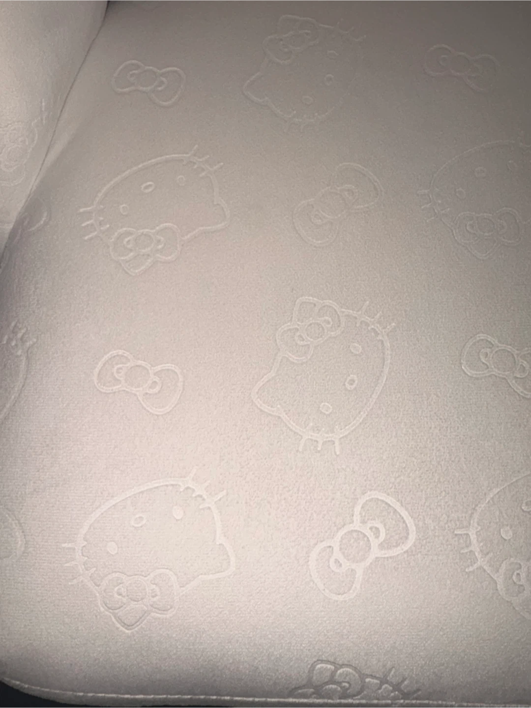 White chair with all-over Hello Kitty embossed pattern. It's a comfortable seat with a curved back. This chair would be fun for a Hello Kitty fan!
