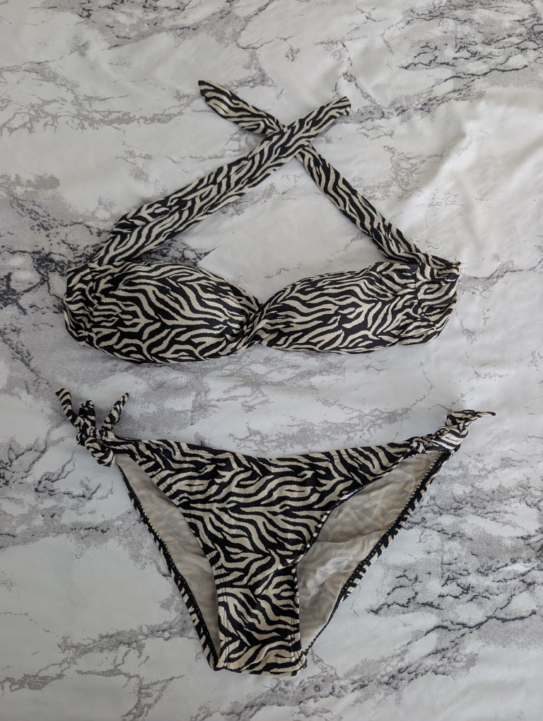 Selling a cute zebra print bikini set! It's in great condition and perfect for summer. The set includes a bandeau top with ties and tie-side bikini bottoms. Comfortable material and is perfect for swimming or lounging by the pool.
