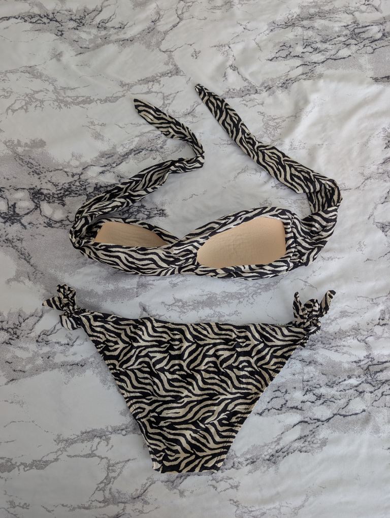 Selling a cute zebra print bikini set! It's in great condition and perfect for summer. The set includes a bandeau top with ties and tie-side bikini bottoms. Comfortable material and is perfect for swimming or lounging by the pool.