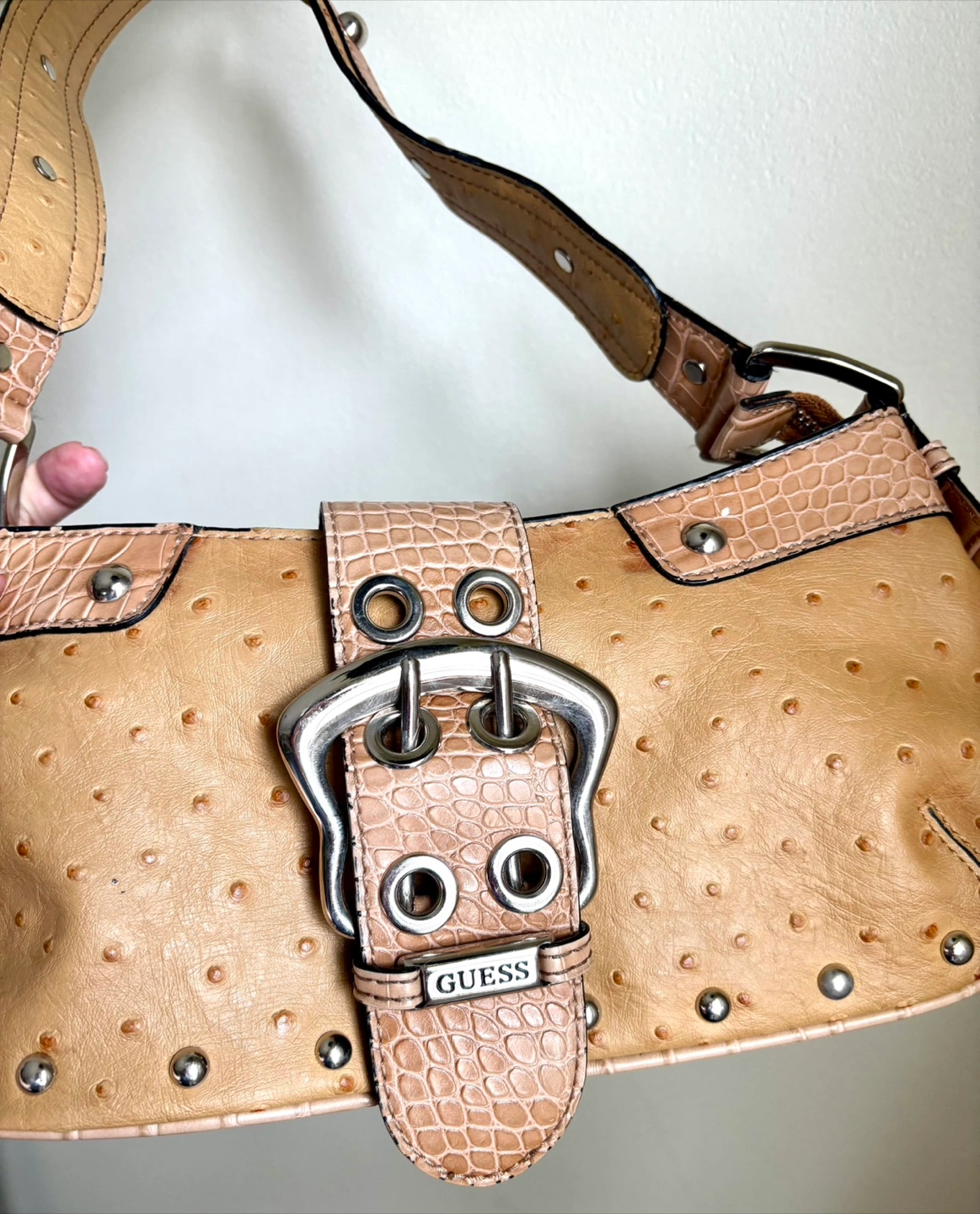 This is a cute Guess shoulder bag with a Y2K aesthetic! It has a beige colour with silver hardware and a unique ostrich-like texture. The strap and detailing are a faux crocodile print. It's in great condition and ready for a new home! Price firm.