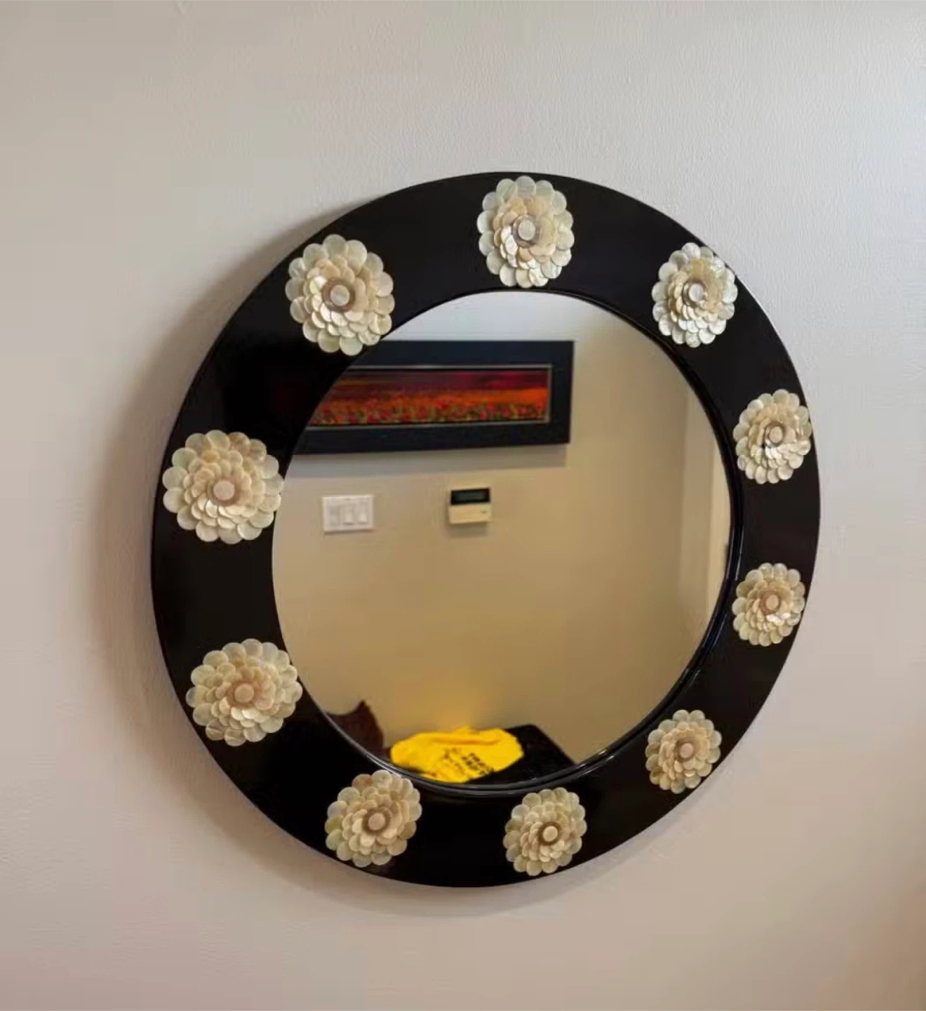 This round wall mirror features a black frame adorned with delicate floral embellishments. It's a lovely accent piece that adds a touch of charm to any room. The mirror is approximately 18 inches in diameter.