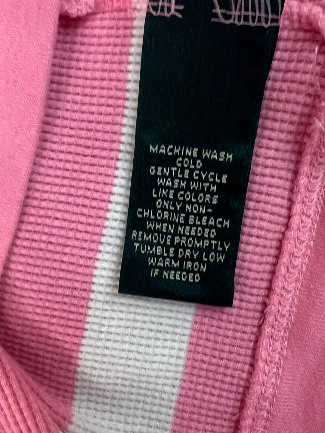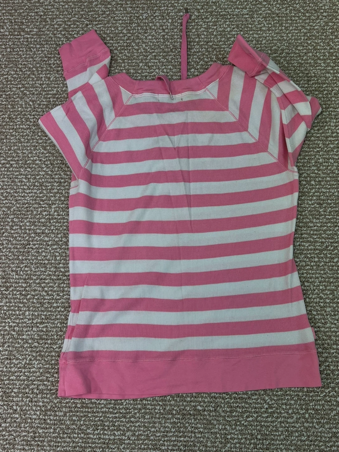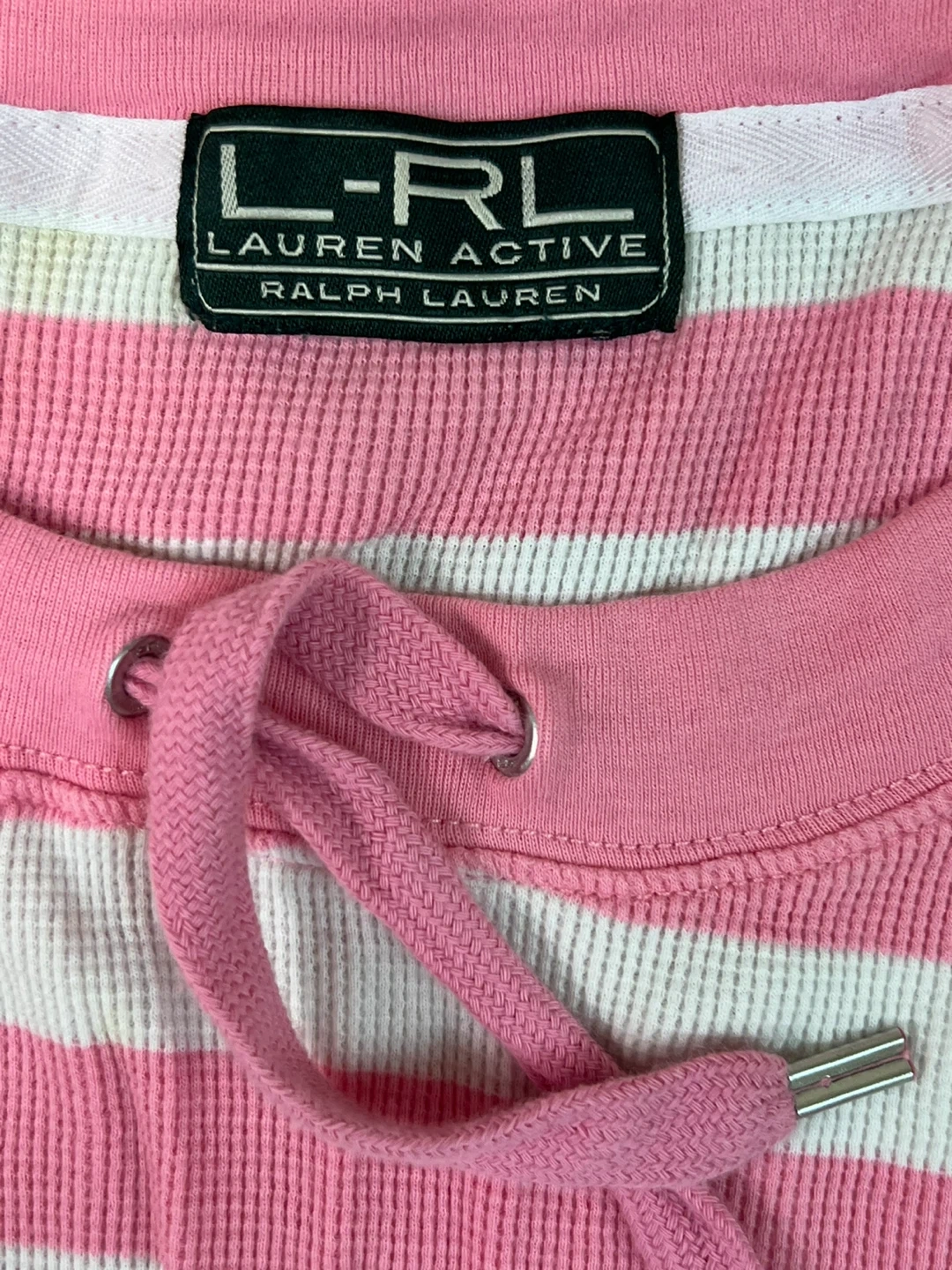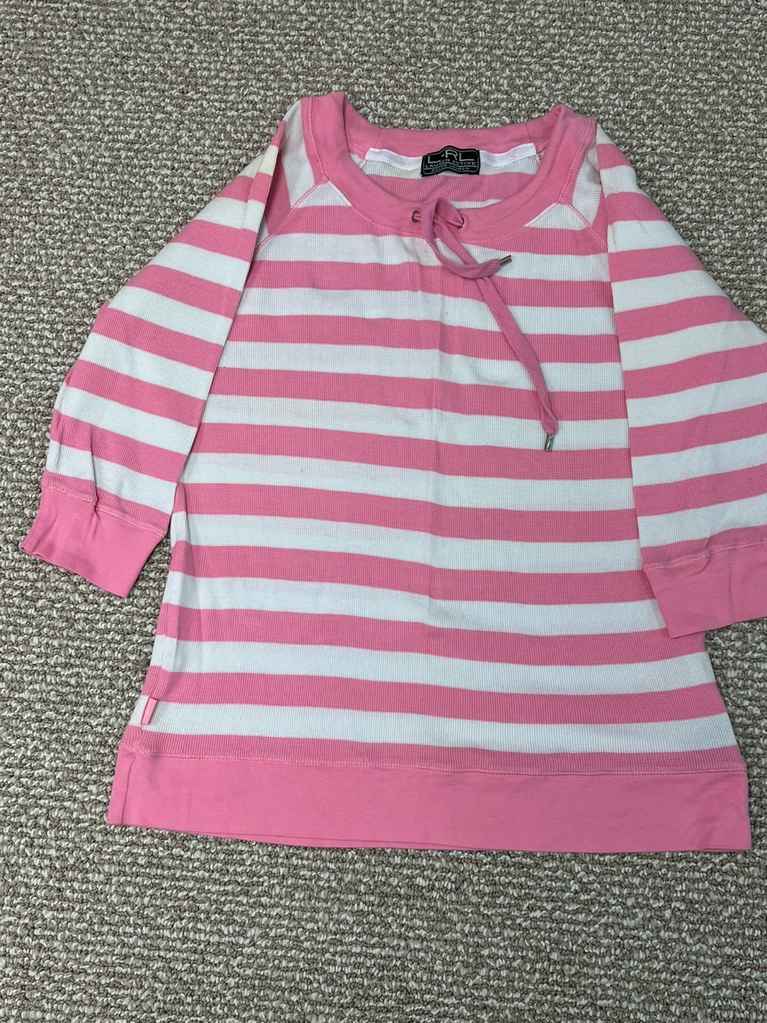 Ralph Lauren L-RL 1/3 sleeve top. Pink and white horizontal stripes. Thermal knit fabric. Features a drawstring neckline. Machine wash cold, gentle cycle. Gently used.