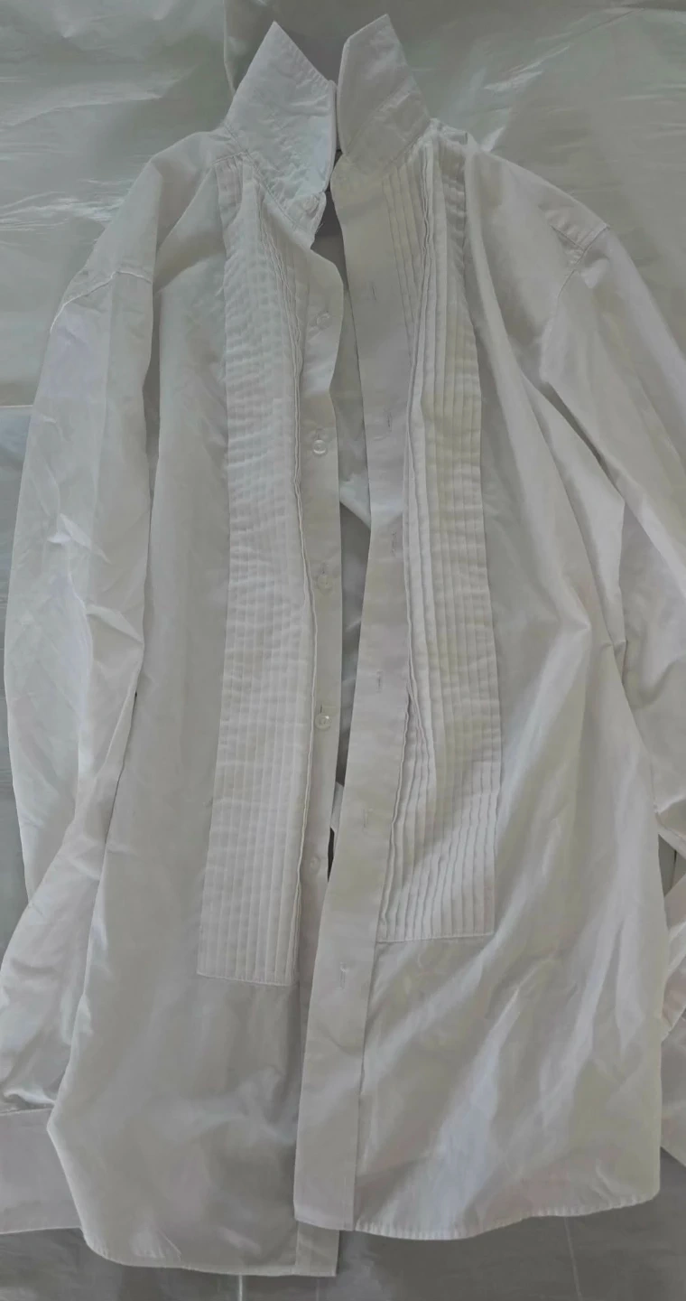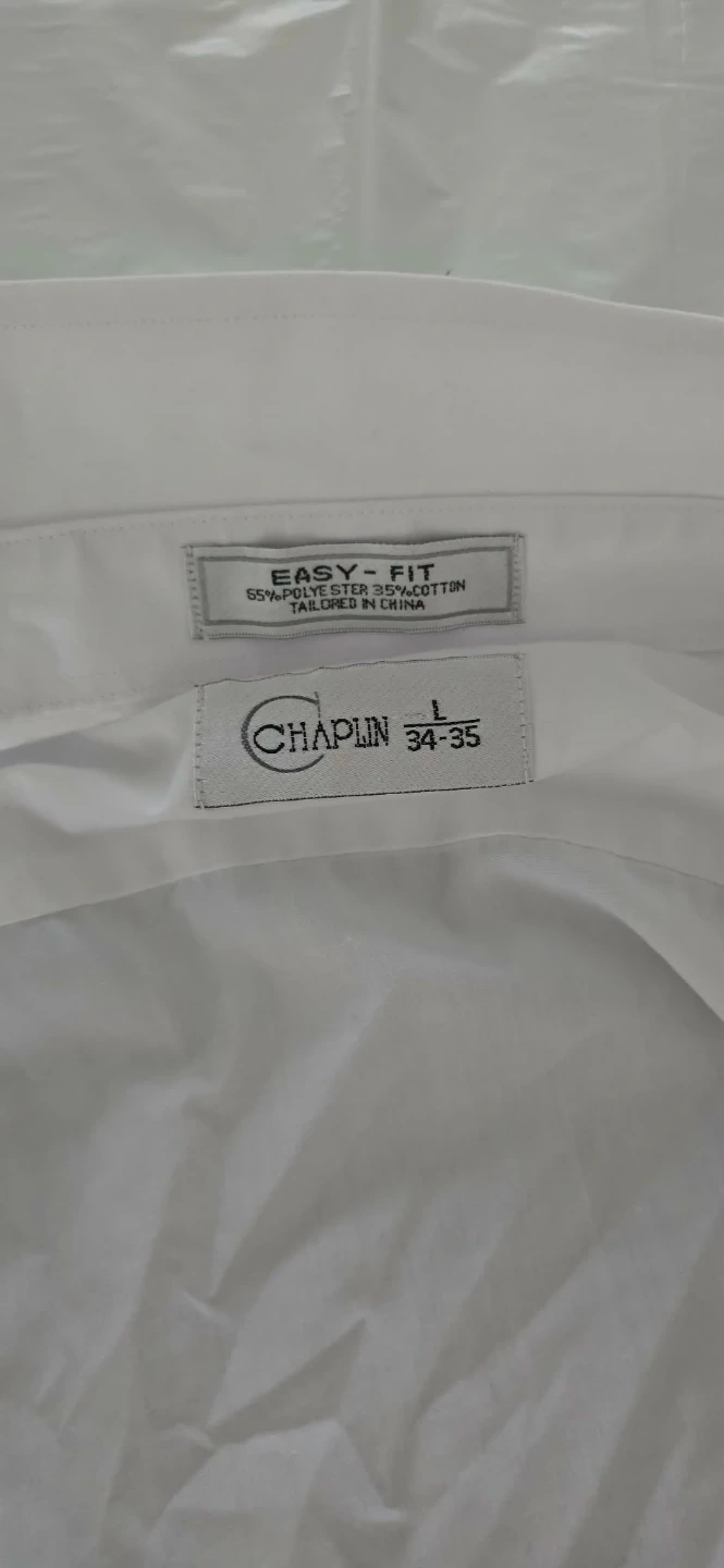 Chaplin men's dress shirt in size large. It's a white, easy-fit dress shirt with a blend of polyester and cotton. This shirt is tailored in China and features a pleated front.