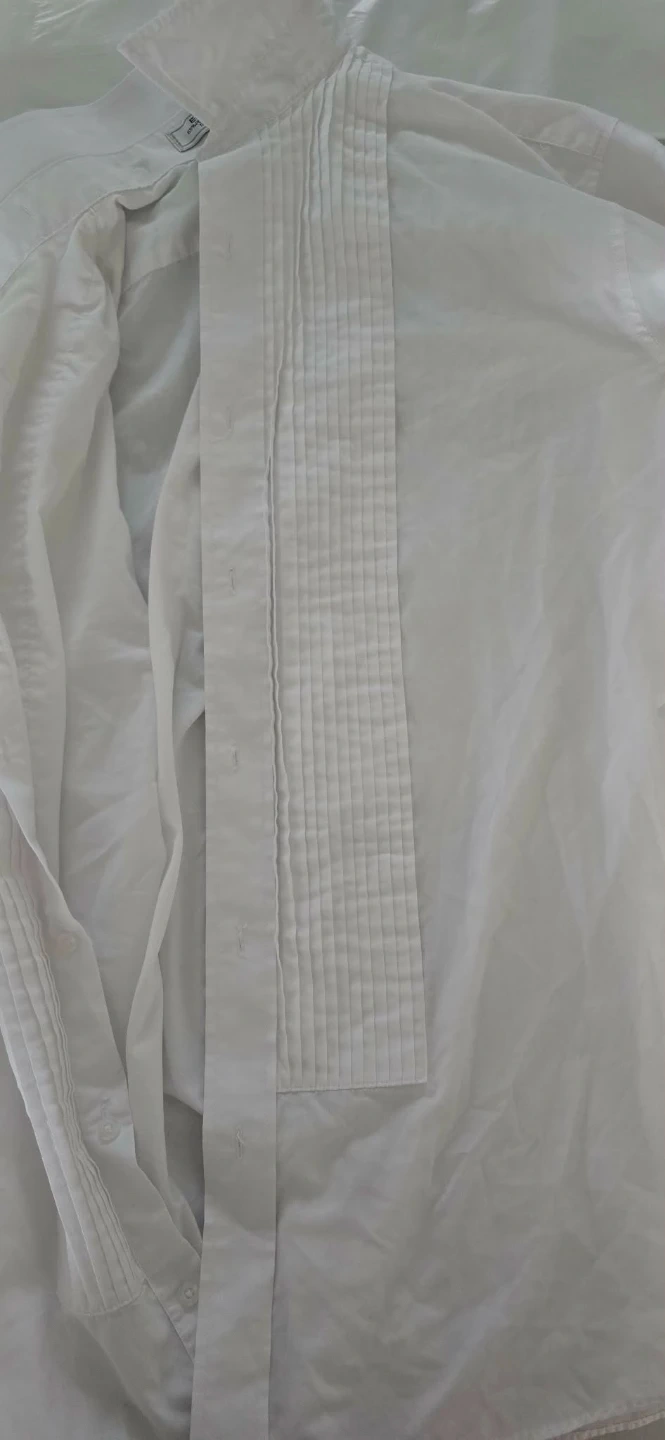 Chaplin men's dress shirt in size large. It's a white, easy-fit dress shirt with a blend of polyester and cotton. This shirt is tailored in China and features a pleated front.