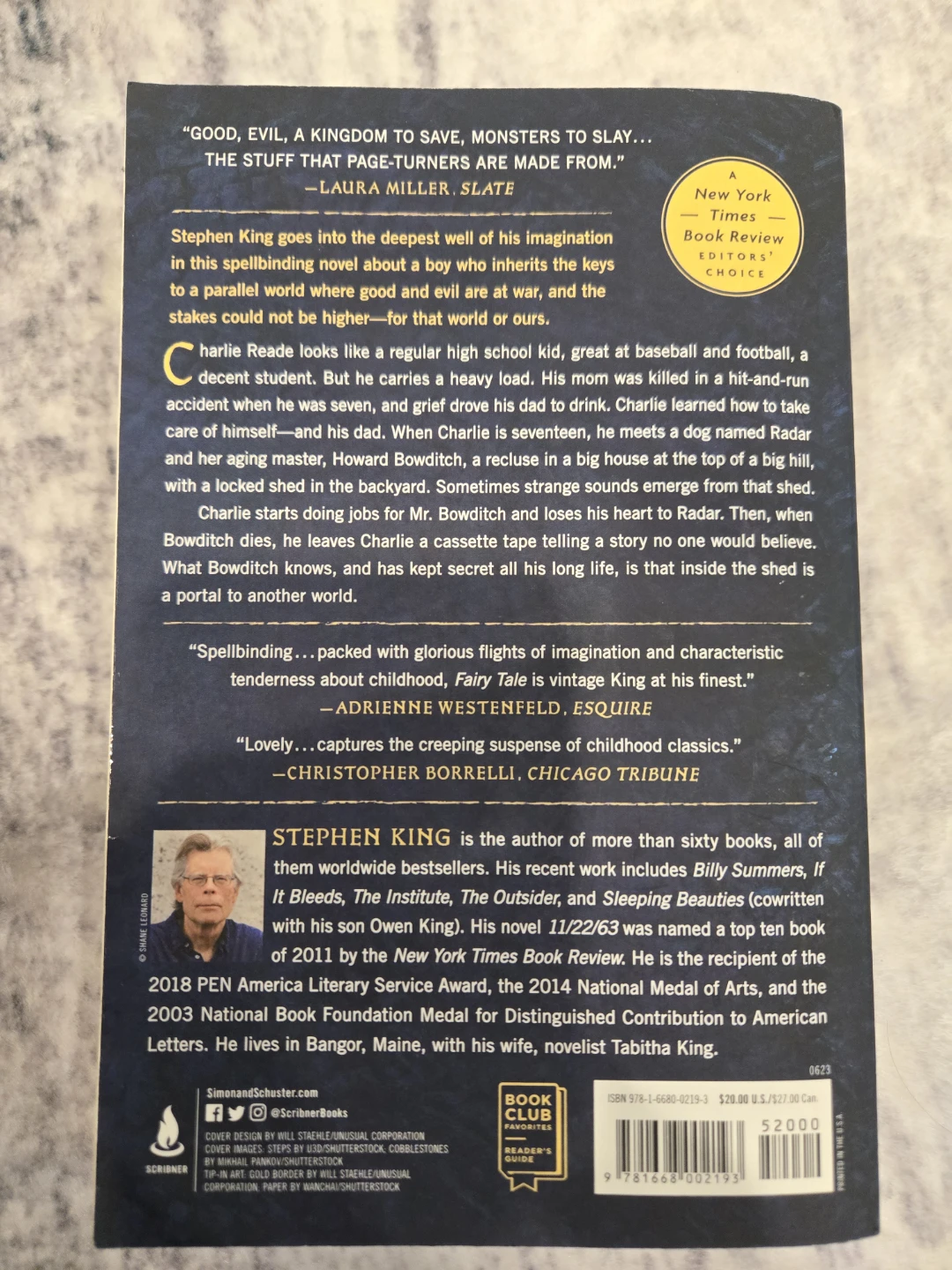 Stephen King's novel Fairy Tale follows a boy who inherits keys to a parallel world where good and evil are at war. It's a spellbinding story with characteristic tenderness about childhood. This book is printed in the USA and features a New York Times Book Review Editors' Choice award.