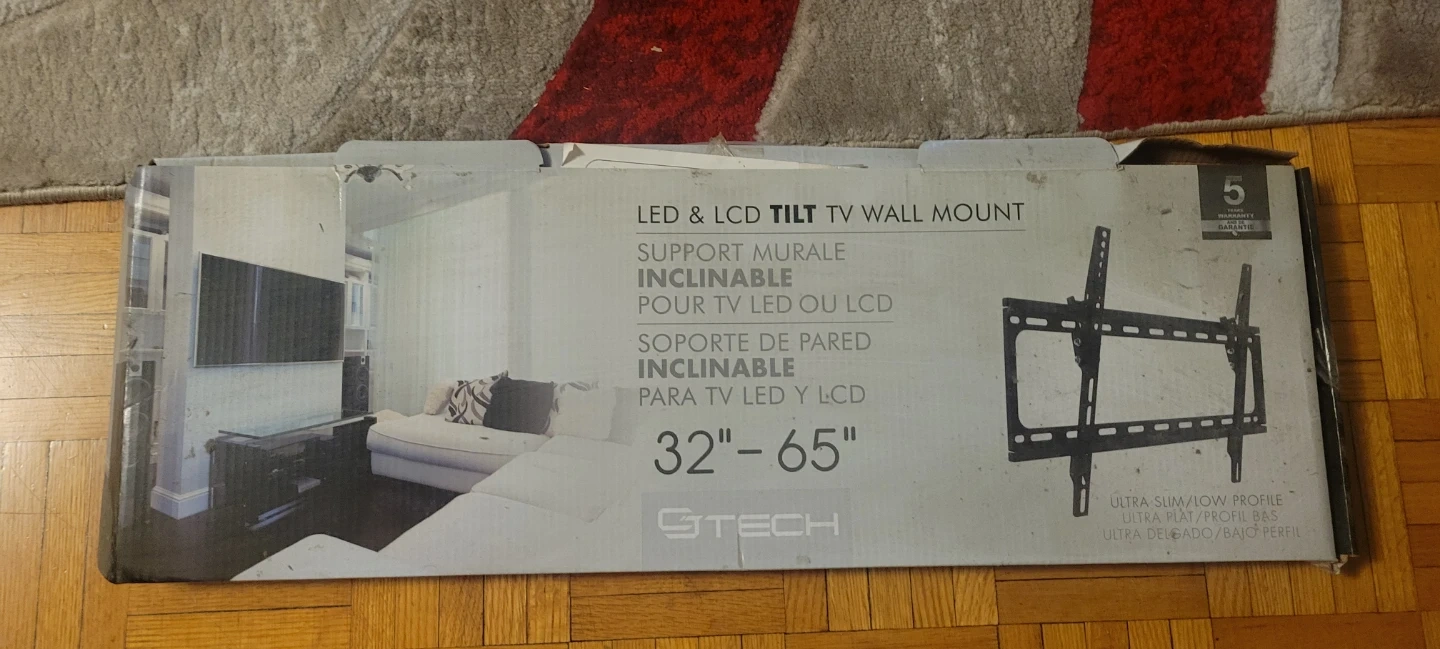 This GTECH TV wall mount supports LED and LCD screens from 32 to 65 inches. It's a tilt mount with an ultra slim flow profile. Comes with original box.