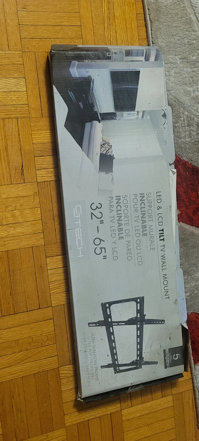 This GTECH TV wall mount supports LED and LCD screens from 32 to 65 inches. It's a tilt mount with an ultra slim flow profile. Comes with original box.