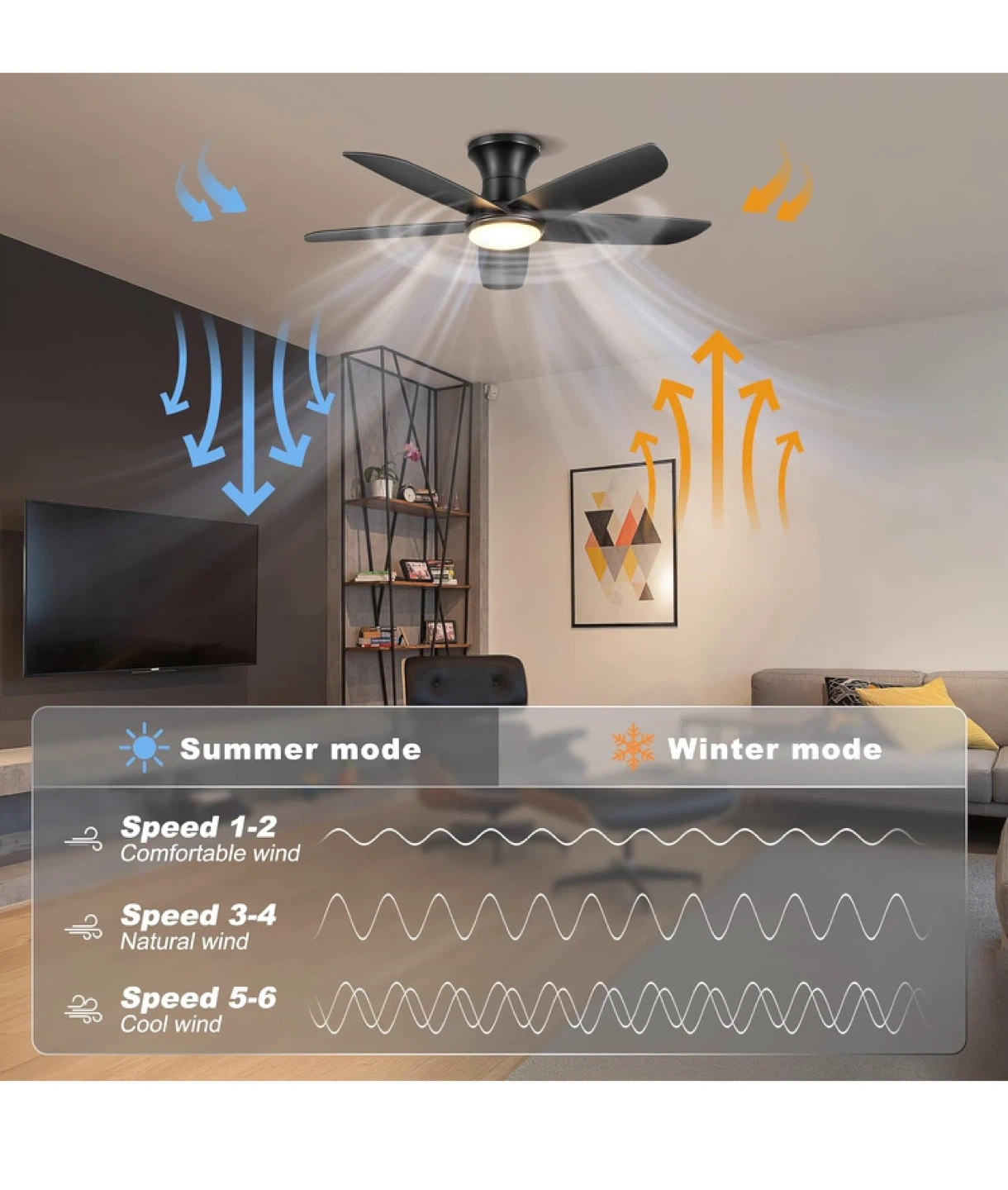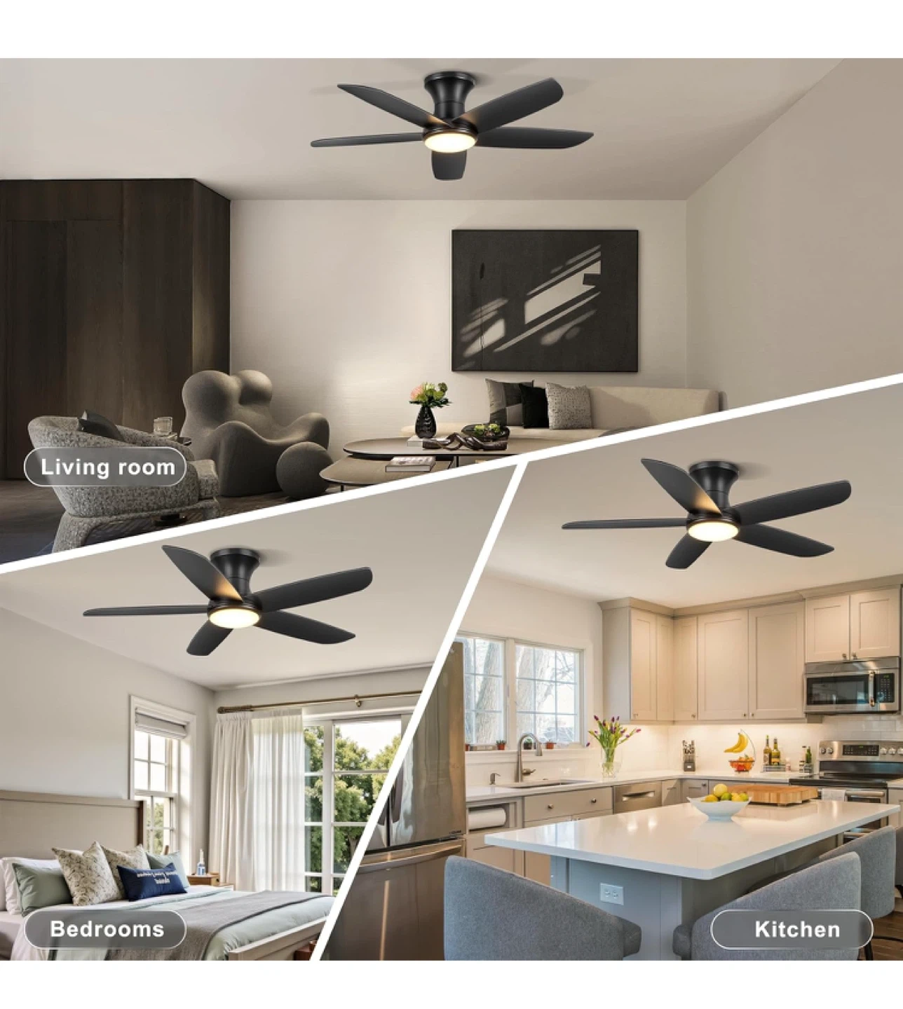 This is a 46 inch ceiling fan with a light that can be flush mounted. It has a dimmable LED light and 3 color temperature options (6000K, 4500K, 3000K). It also has a powerful reversible DC motor and is energy saving. It operates quietly at 35dB max and features remote and app control.