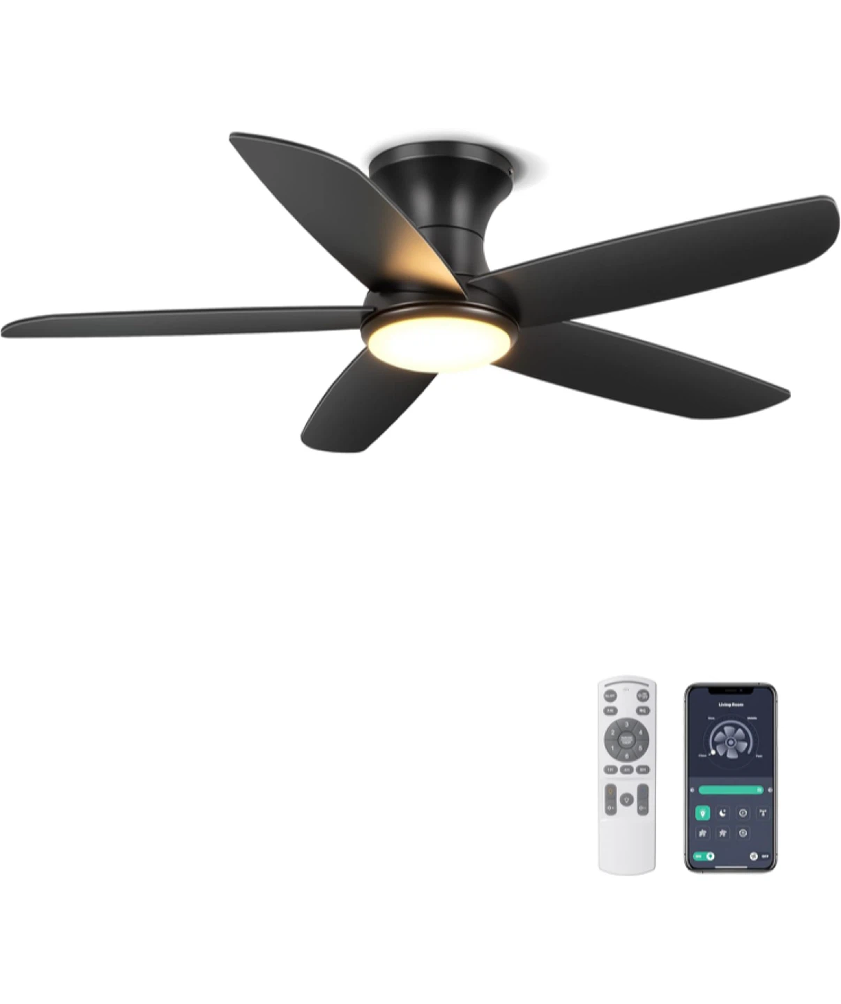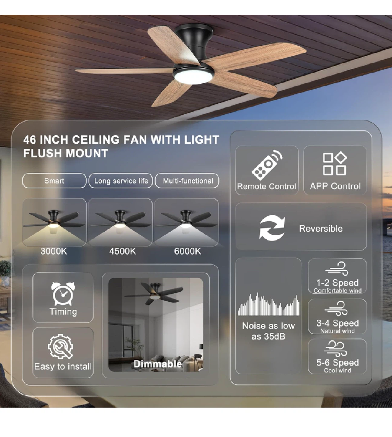 This is a 46 inch ceiling fan with a light that can be flush mounted. It has a dimmable LED light and 3 color temperature options (6000K, 4500K, 3000K). It also has a powerful reversible DC motor and is energy saving. It operates quietly at 35dB max and features remote and app control.