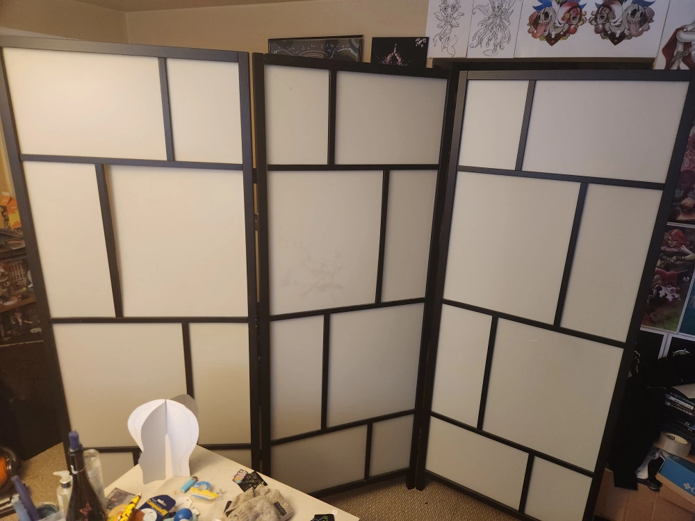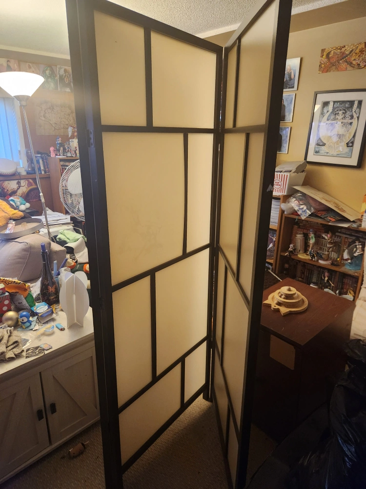Foldable privacy divider. Lightly used. Minor imperfection on one of the panels but still serves it's function.