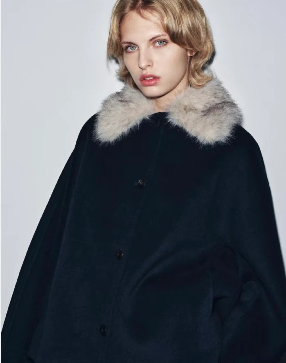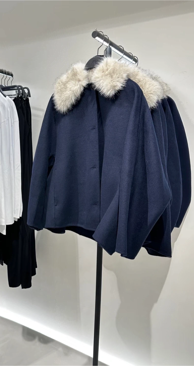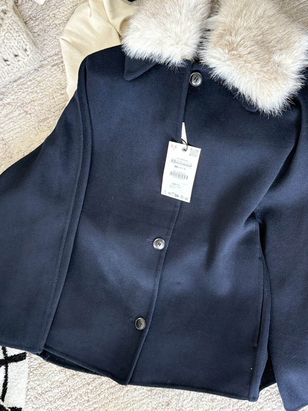 This stylish navy blue jacket features a detachable faux fur collar and button closure. It's a size XS and made from a wool blend. This cape adds a touch of elegance to any outfit!