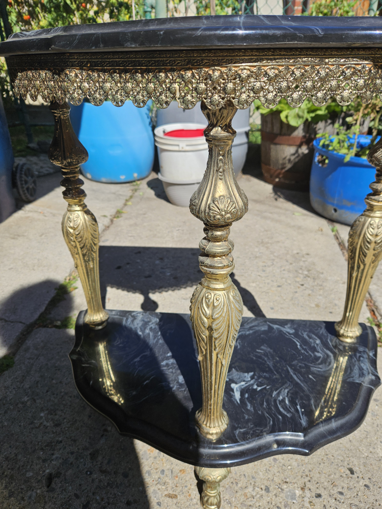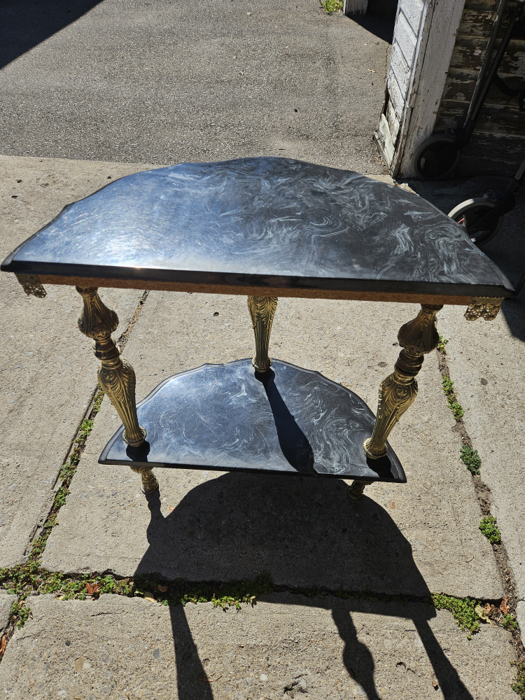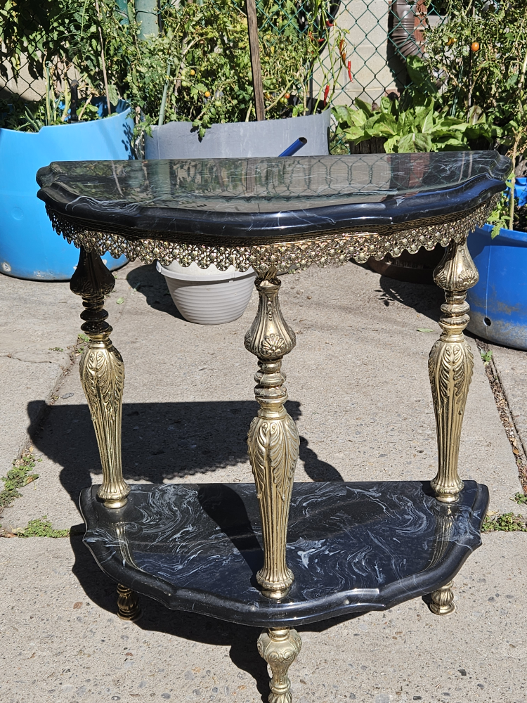 Selling a vintage half-moon accent table with a marble top and ornate gold-tone legs. It's a unique piece that would add a touch of elegance to any room. The table is in good condition and ready for a new home!