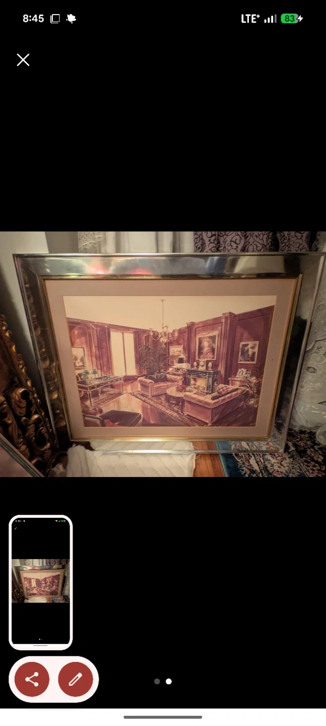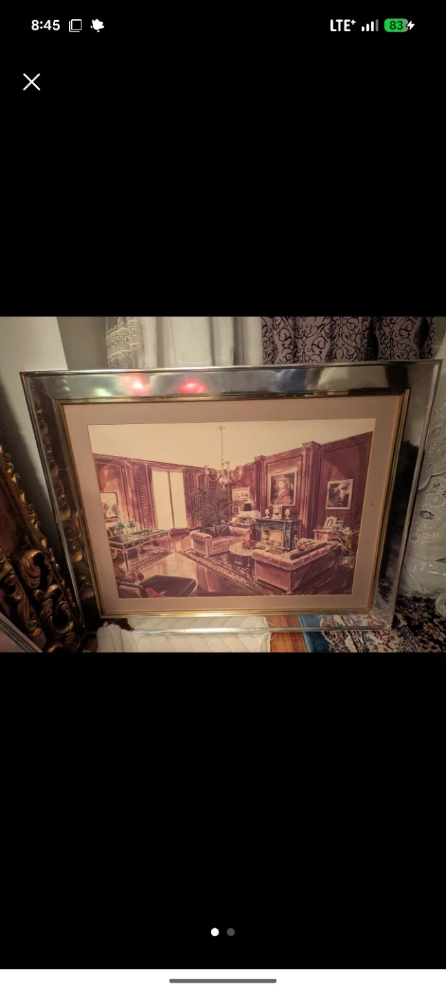 Framed art print depicting a luxurious living room scene. It's matted and encased in a silver-toned frame. Ready to hang and add a touch of elegance to your space!