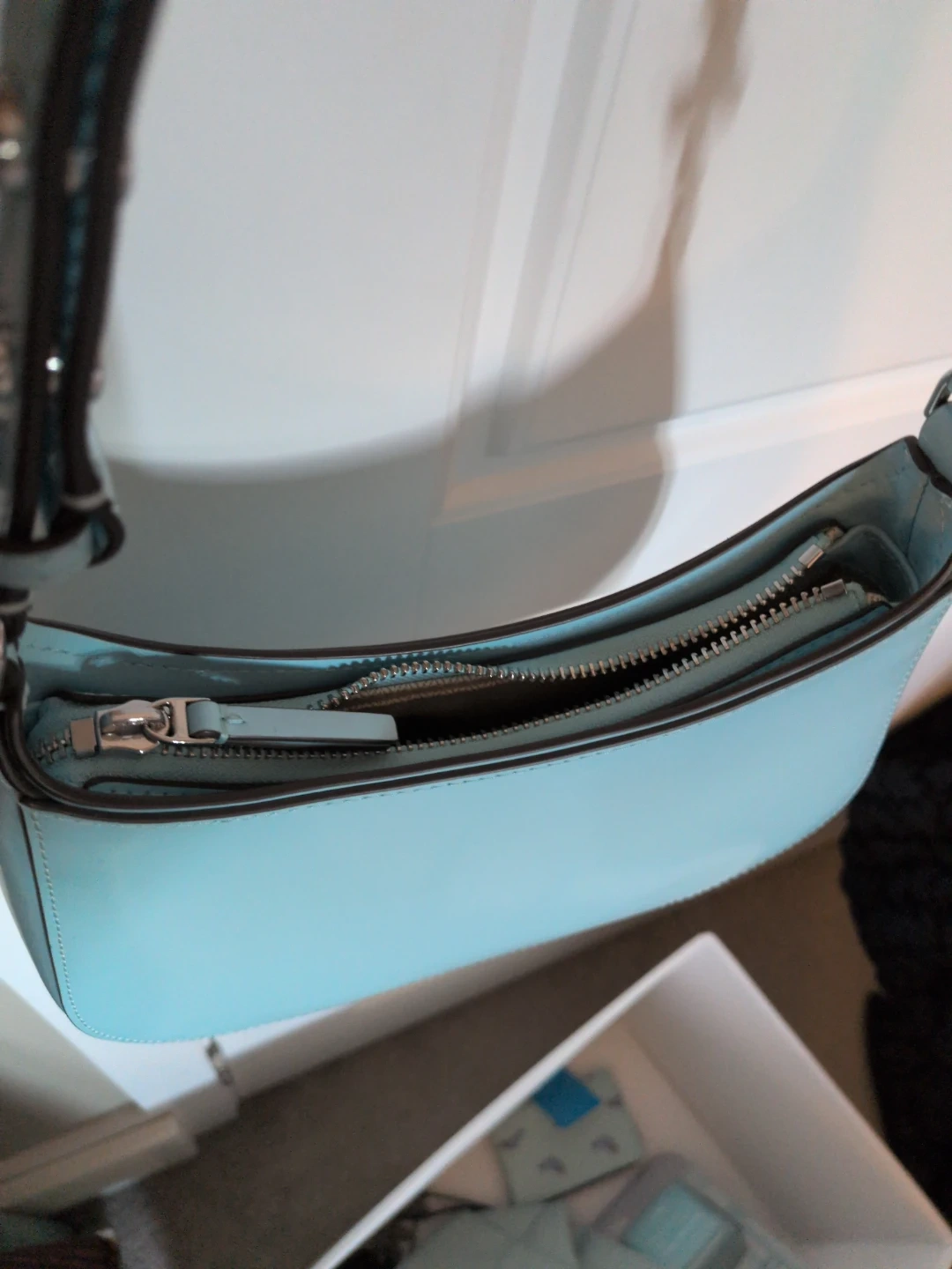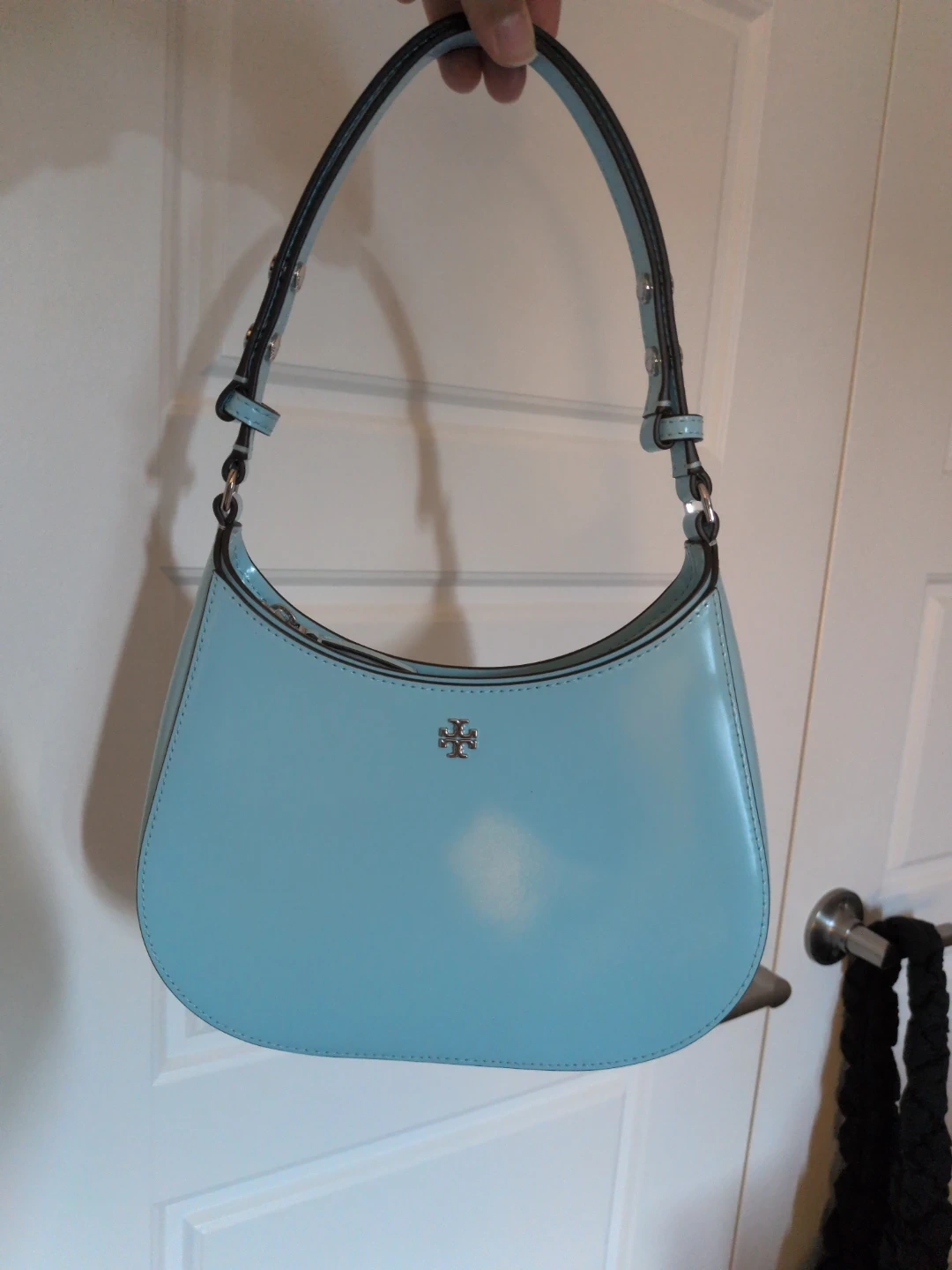This light blue Tory Burch shoulder bag features a zip closure and strap with silver-tone hardware. It's made from smooth leather with contrasting black trim. This bag is perfect for everyday use. Never used.