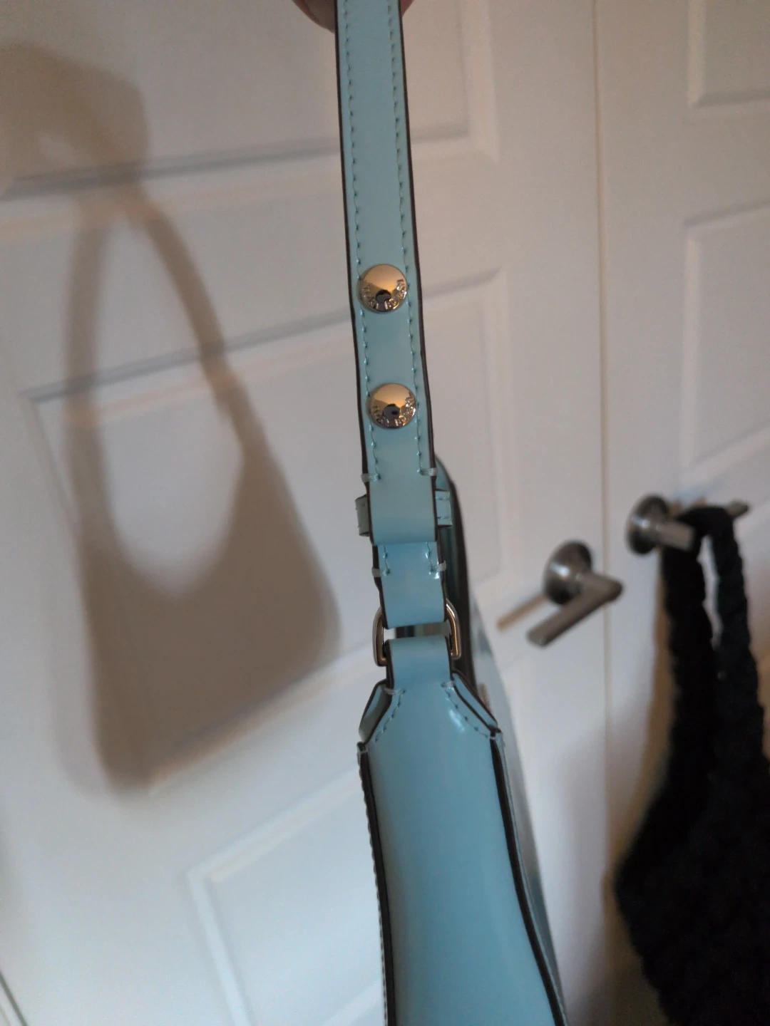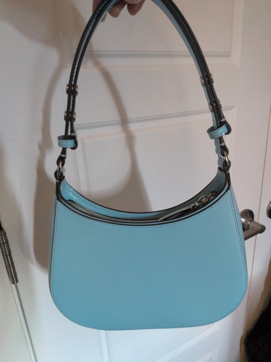 This light blue Tory Burch shoulder bag features a zip closure and strap with silver-tone hardware. It's made from smooth leather with contrasting black trim. This bag is perfect for everyday use. Never used.