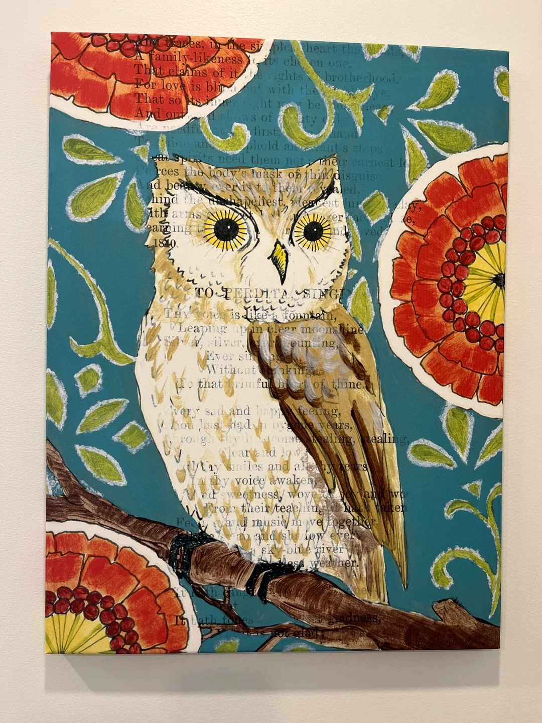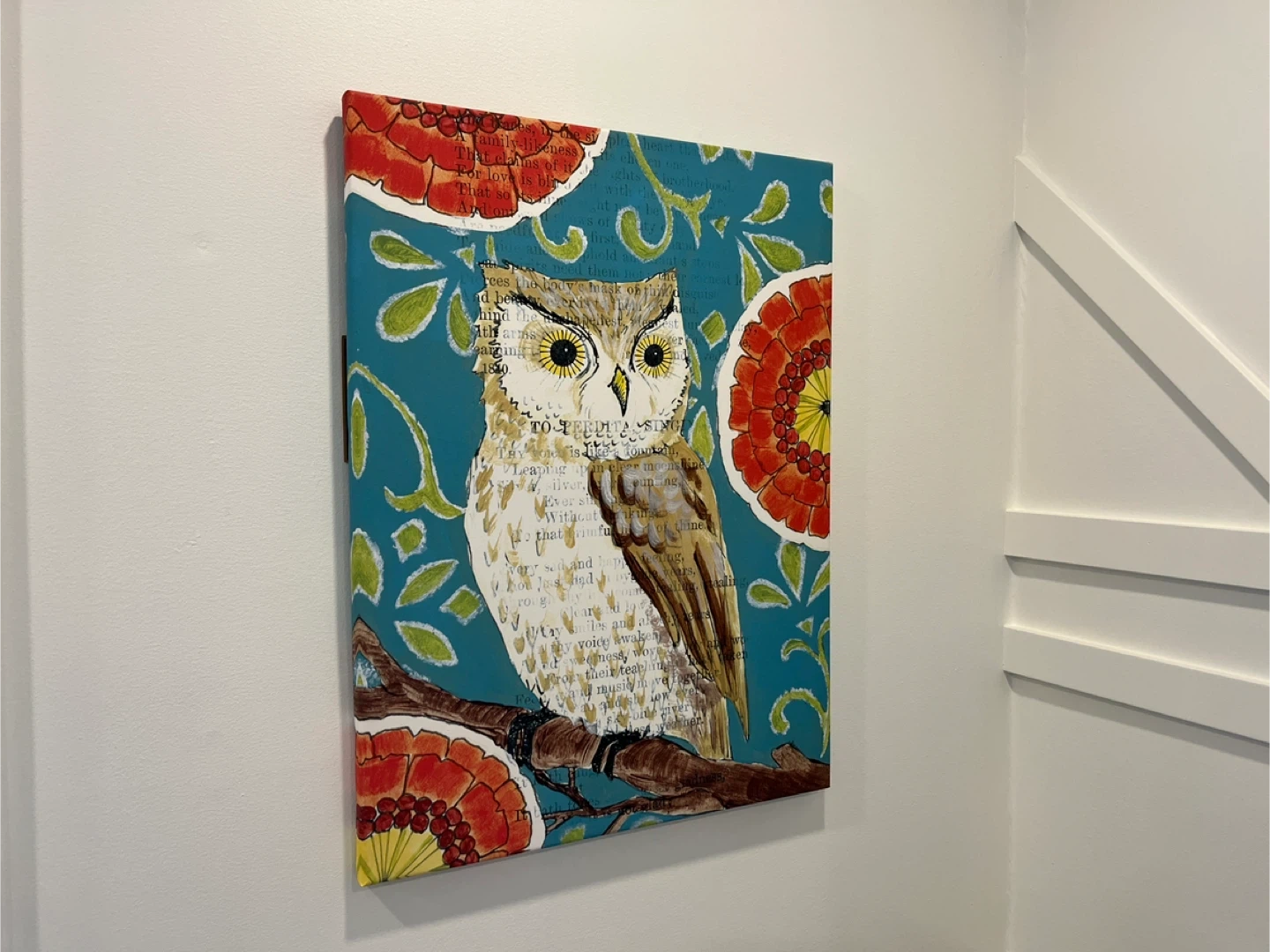 This Pier 1 Imports canvas art features a wise owl design on a teal background with floral accents. The owl is perched on a branch, and elements of text are incorporated into the artwork. It's a charming piece that adds a touch of personality to any room!