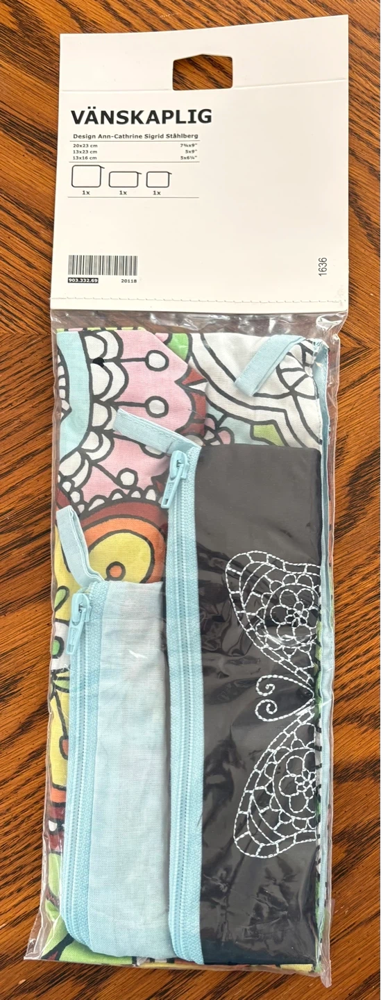 This is a set of three VÄNSKAPLIG zipper bags from IKEA. They feature a colourful floral and butterfly design. The bags are made of 100% cotton. They're great for organizing small items!