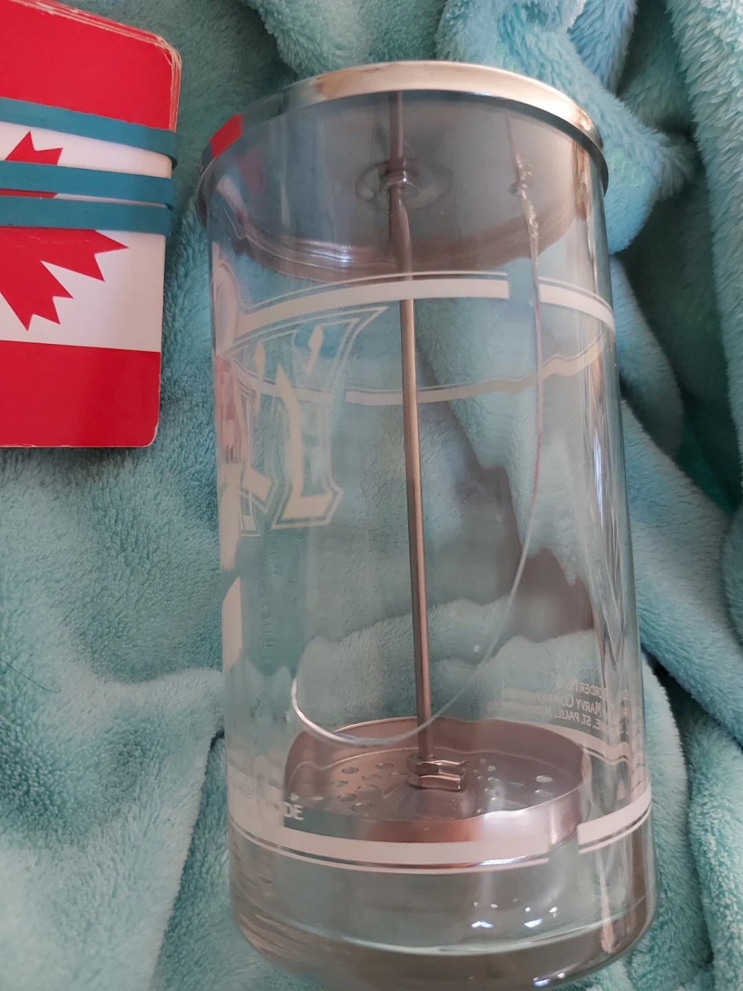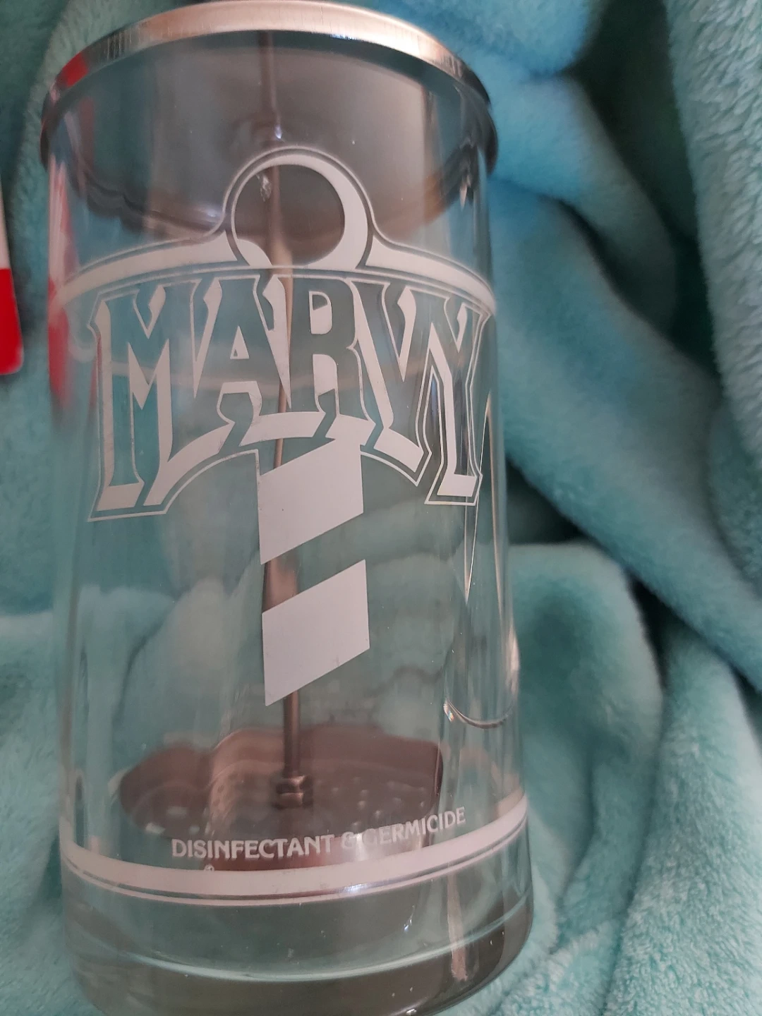 This is a MARVY glass container designed for disinfectant and germicide. It has a metal lid and a central rod with a base. This would be useful for storing disinfectants in a salon or barbershop. Unfortunately, it has a crack on the side in the photo. It isn't cracked through, so it can be glued with crazyglue on the outside for reassurance of no leaks.