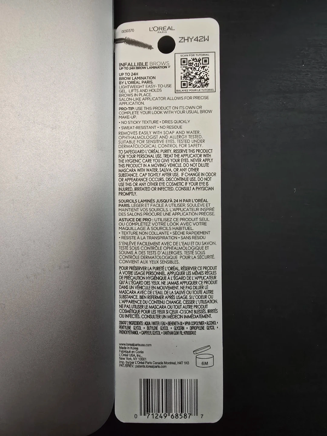 Get salon-worthy brows at home with L'Oreal's Infallible Brows Brow Lamination! This lightweight, easy-to-use formula locks brows in place for up to 24 hours. The precise angled applicator allows for accurate application, whether you wear it on its own or to complete your regular brow look. It dries quickly with no sticky texture and removes easily with soap and water. Suitable for sensitive eyes and tested under dermatological control