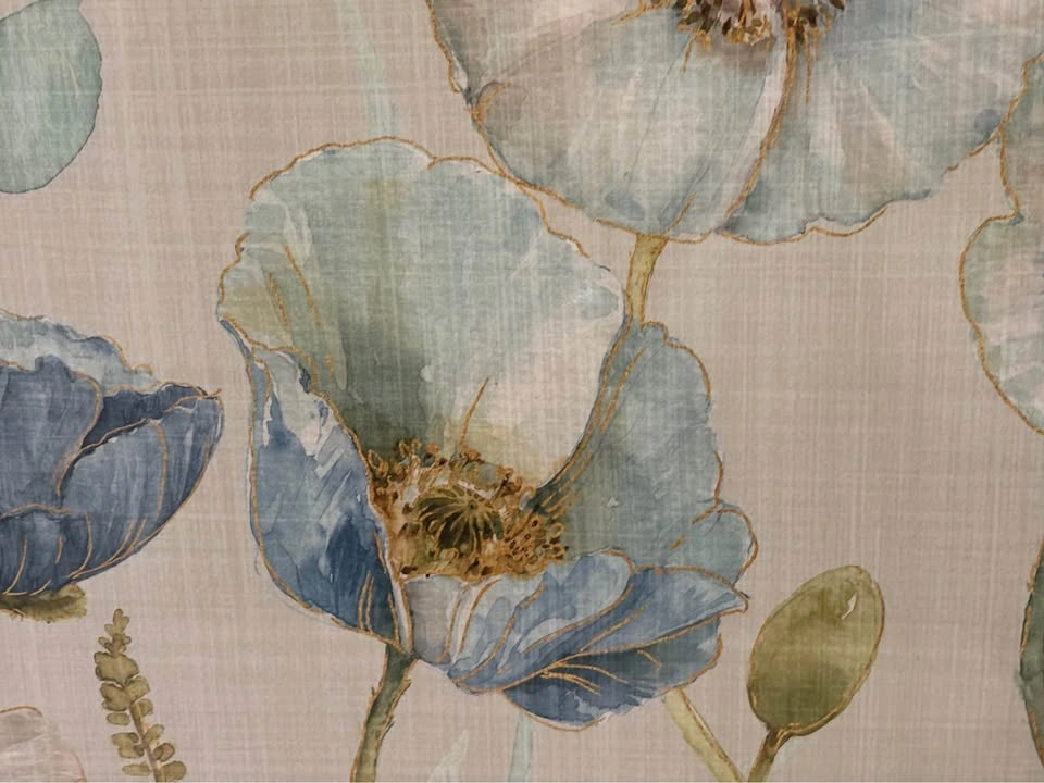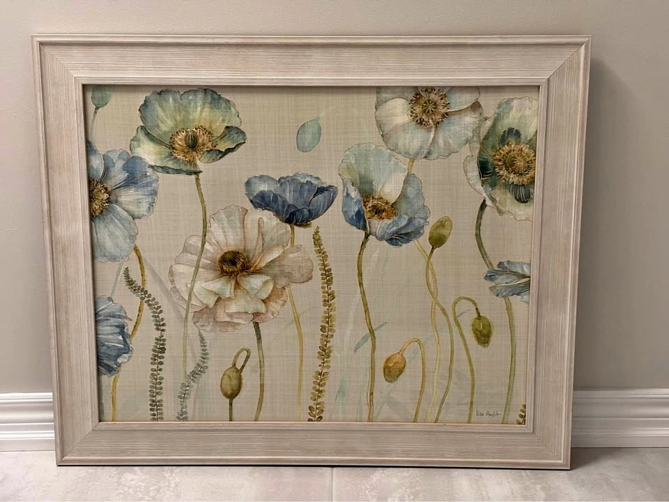 Pretty blue flowers in a meadow, shiny surface. Beige beveled frame. 27.5" w x 33.5" h. See last pic for condition noted on top back of the frame, otherwise good condition.