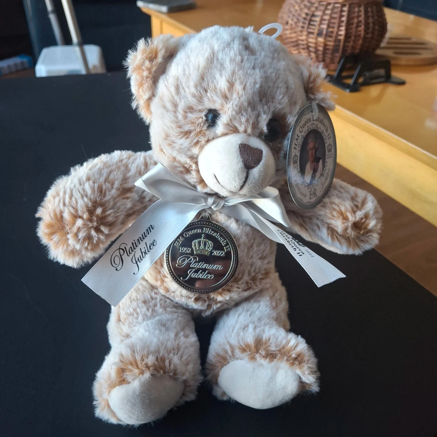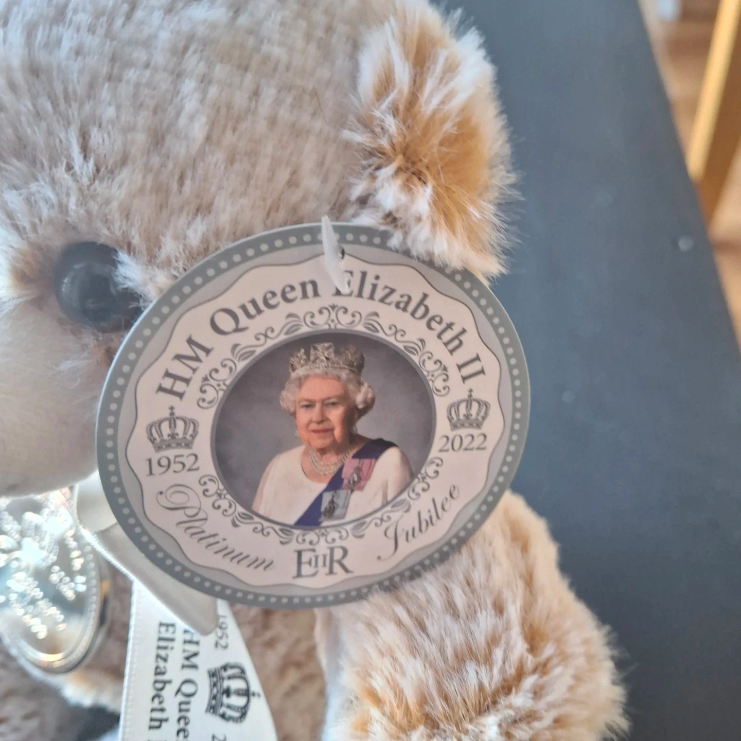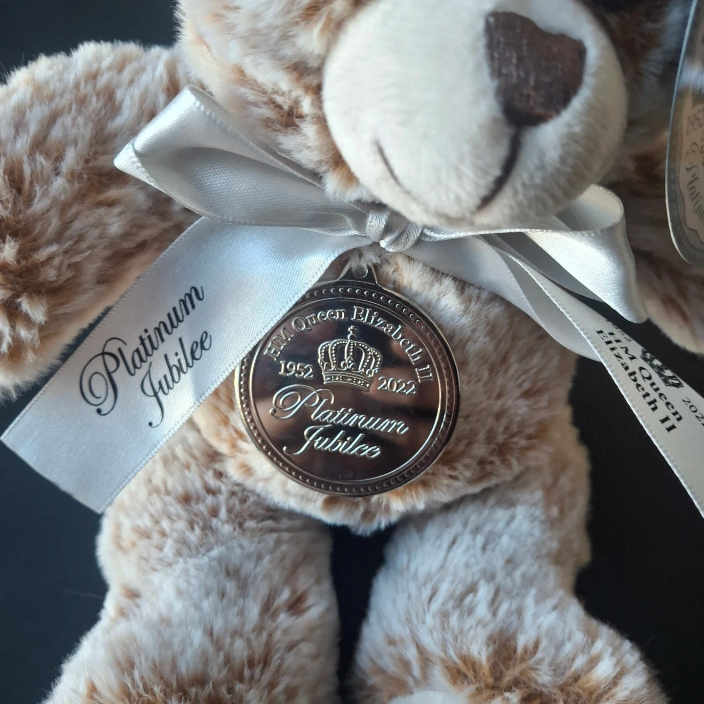 A plush teddy bear commemorating HM Queen Elizabeth II's Platinum Jubilee. It features a decorative tag with the Queen's portrait and a medallion with "Platinum Jubilee 1952-2022" inscribed. The bear is adorned with a satin ribbon.