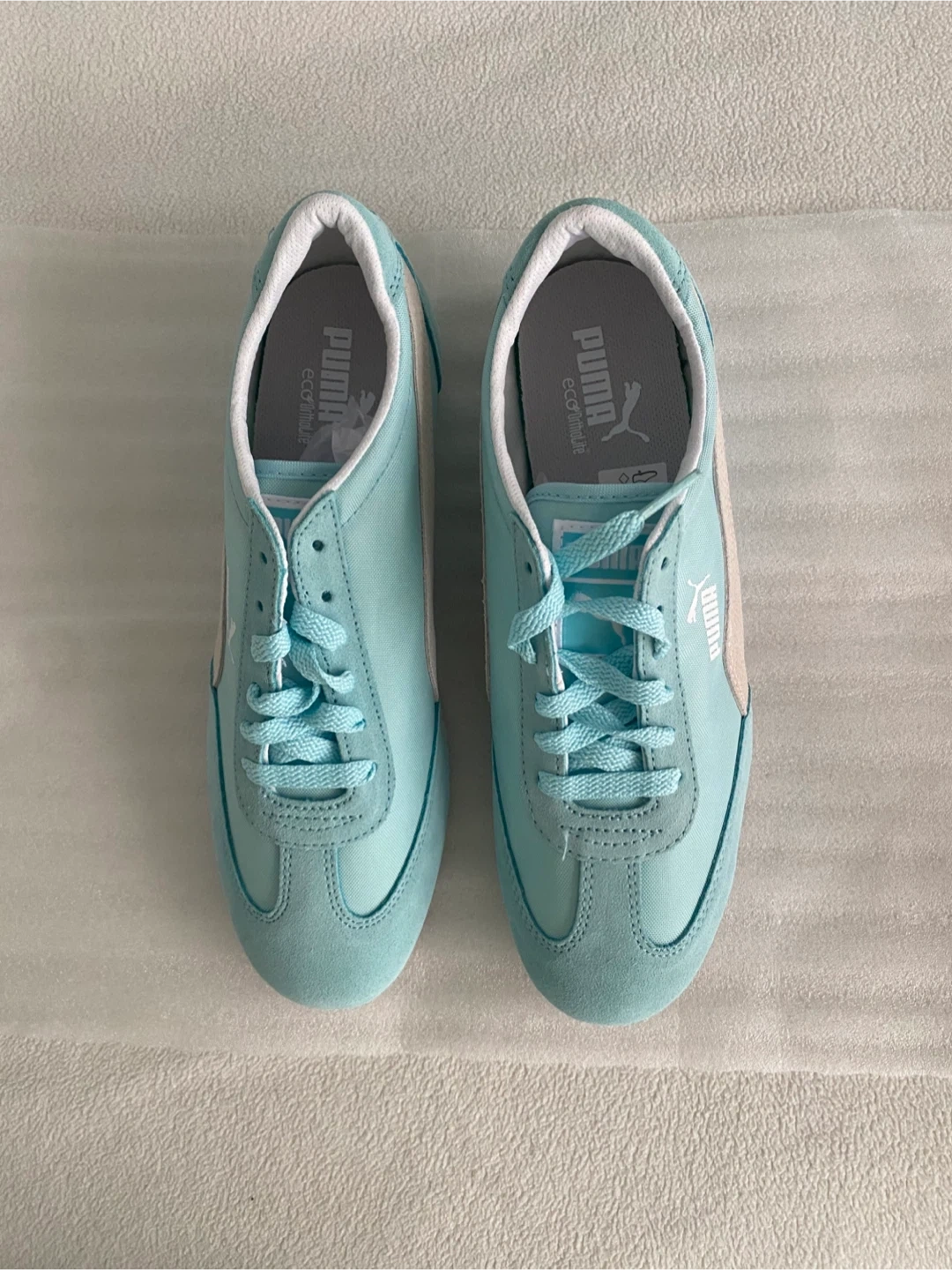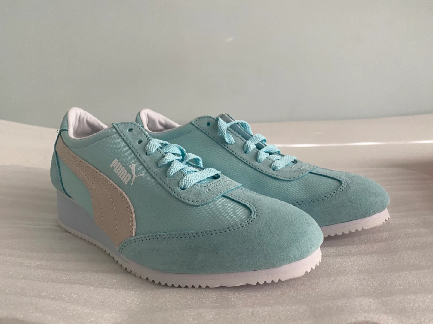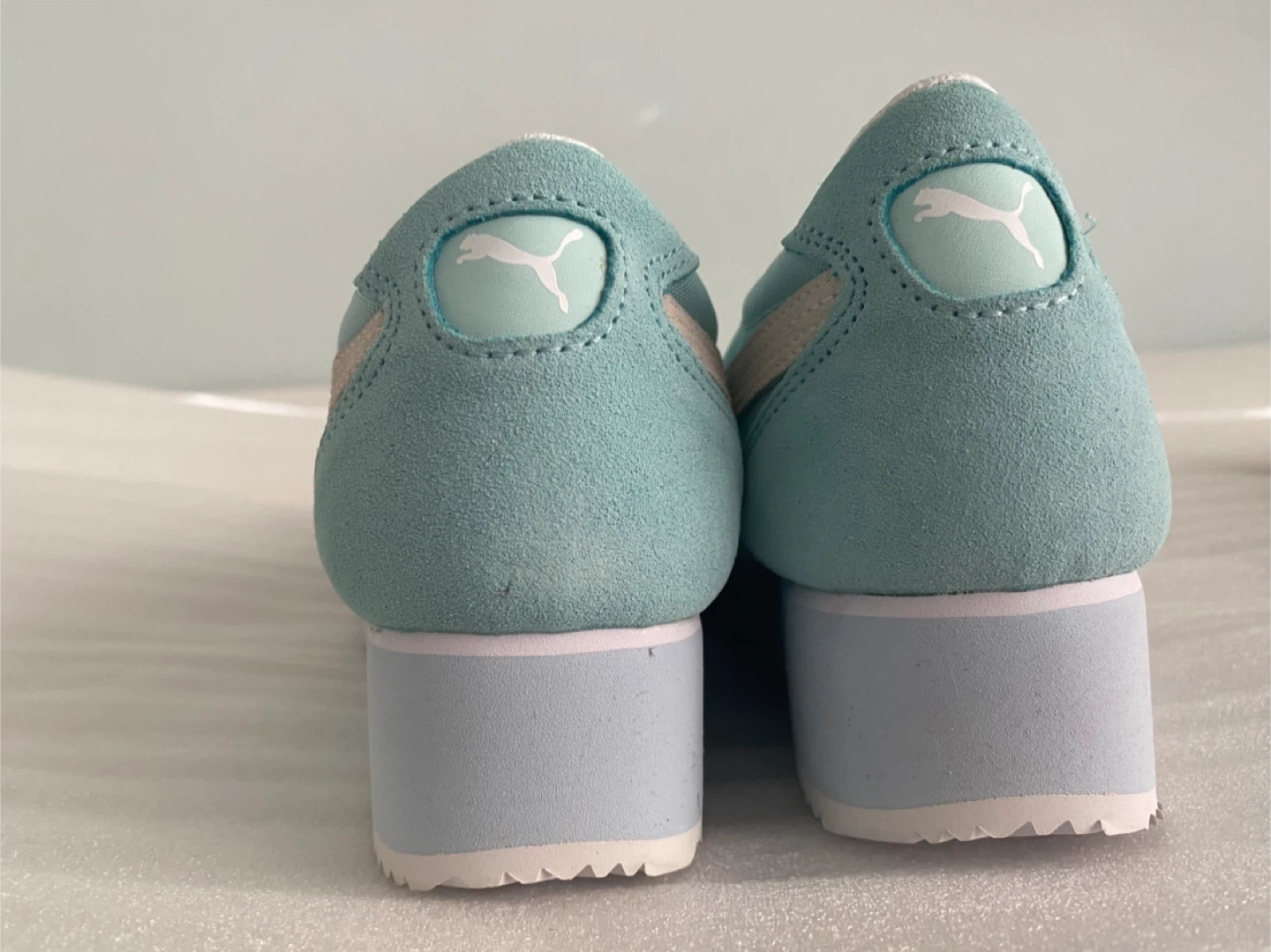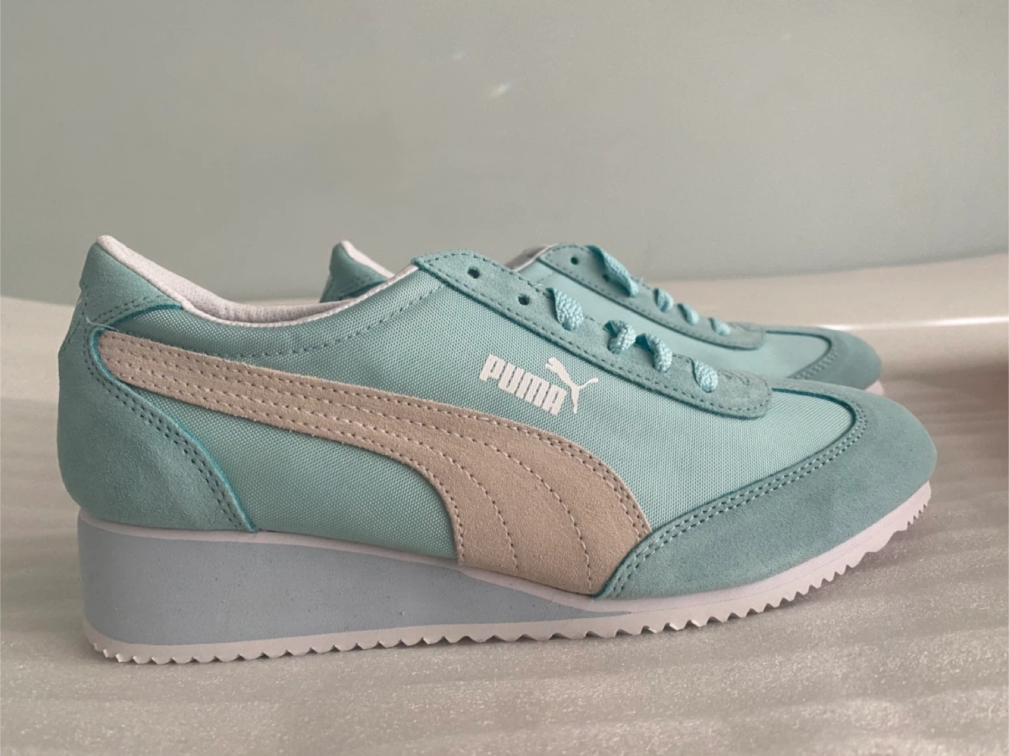Puma women's wedge sneakers in a light blue color. Suede and textile upper with a rubber sole. Features a platform wedge heel for added height. Comfortable and stylish for everyday wear!