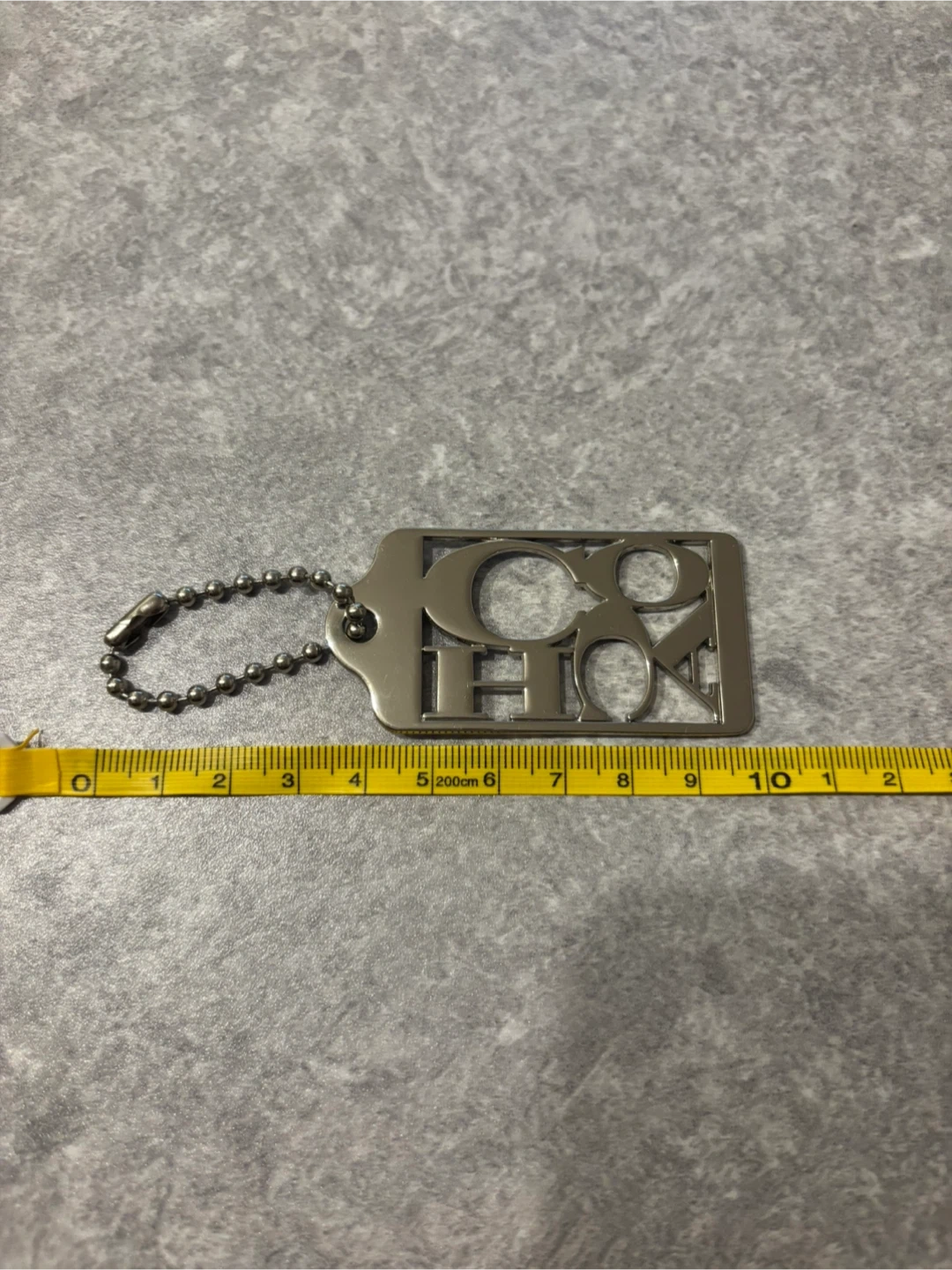 This is a Coach keychain tag with the brand's signature logo cut out. It's made of metal and includes a silver ball chain.