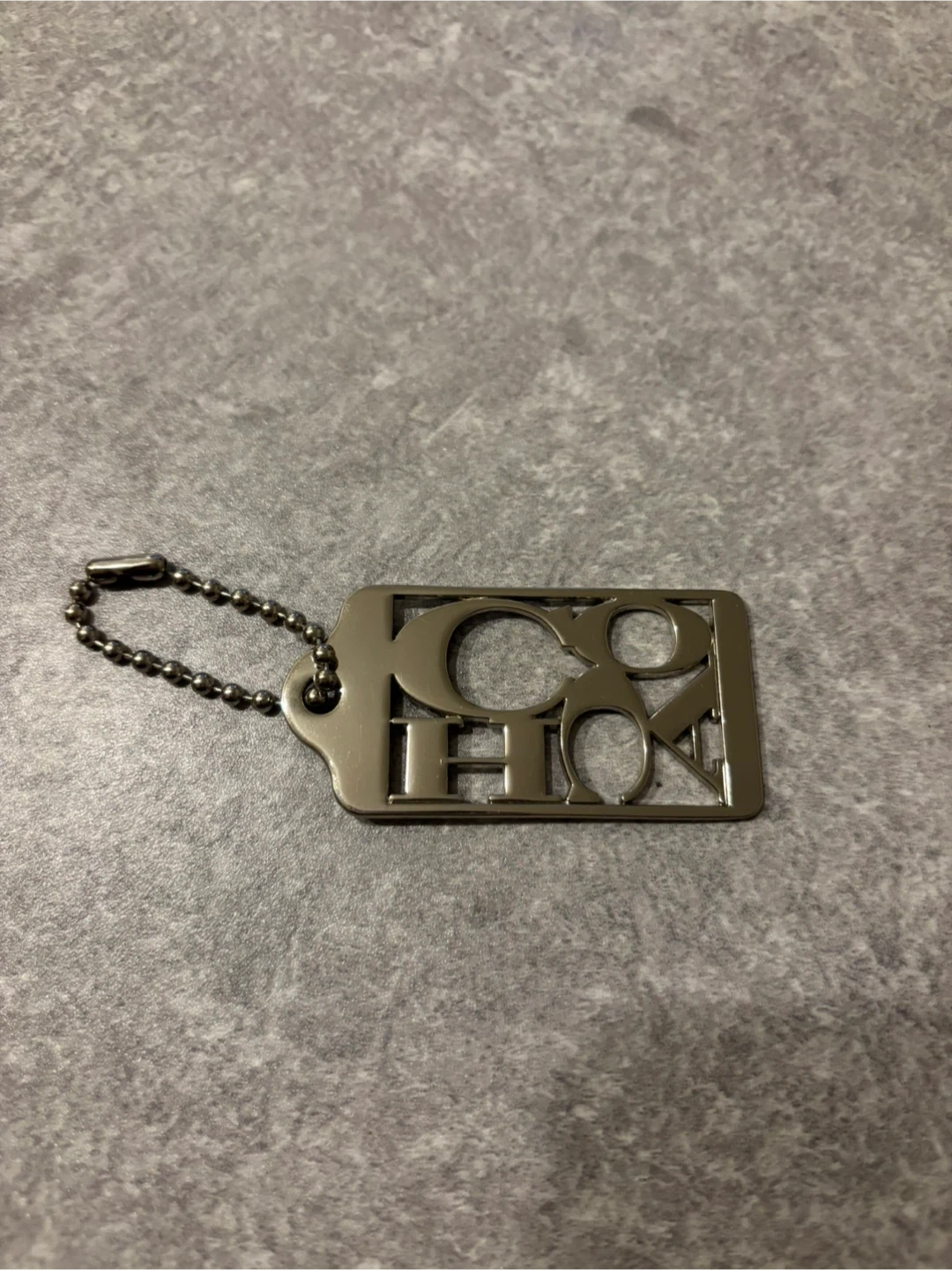 This is a Coach keychain tag with the brand's signature logo cut out. It's made of metal and includes a silver ball chain.