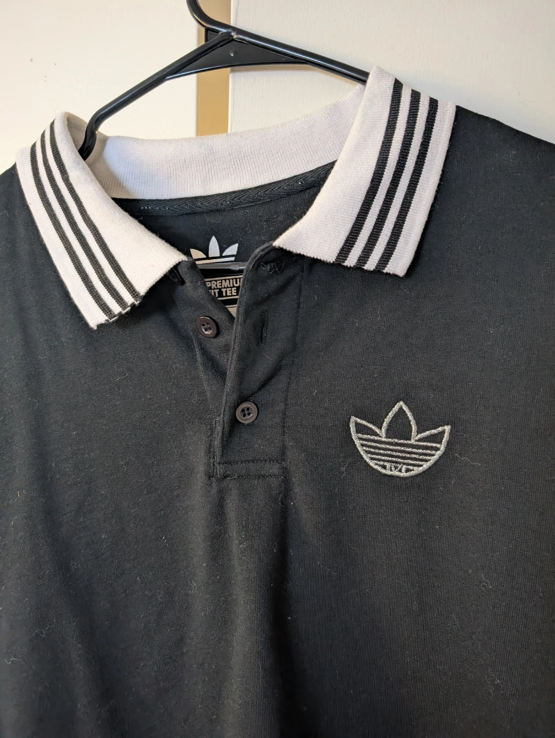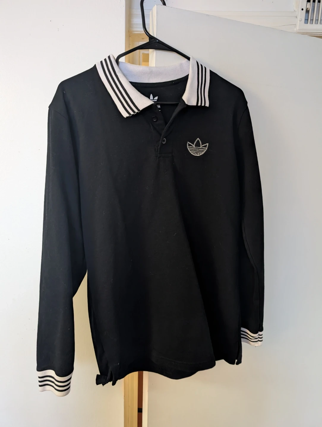 This long-sleeved Adidas shirt is a size large and made from 100% polyester. It features a classic polo collar with striped detailing.