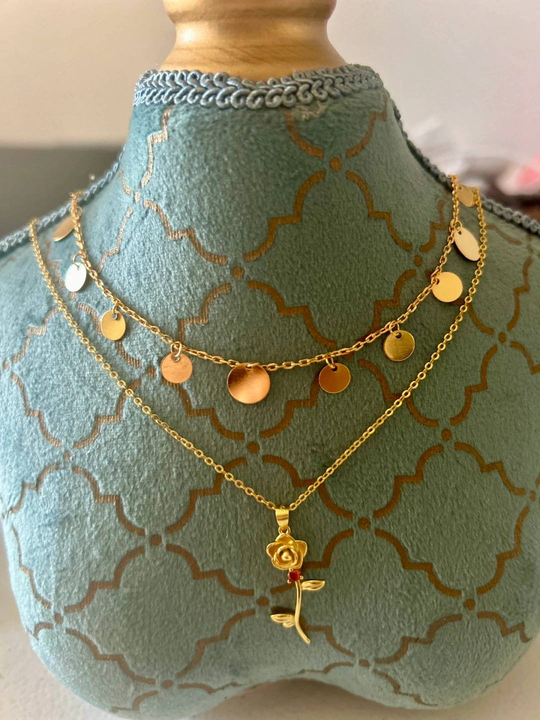 Beautiful gold plated layered necklace set. Features a delicate chain with small gold discs and a charming rose pendant with a red gemstone accent. Perfect for adding a touch of elegance to any outfit.