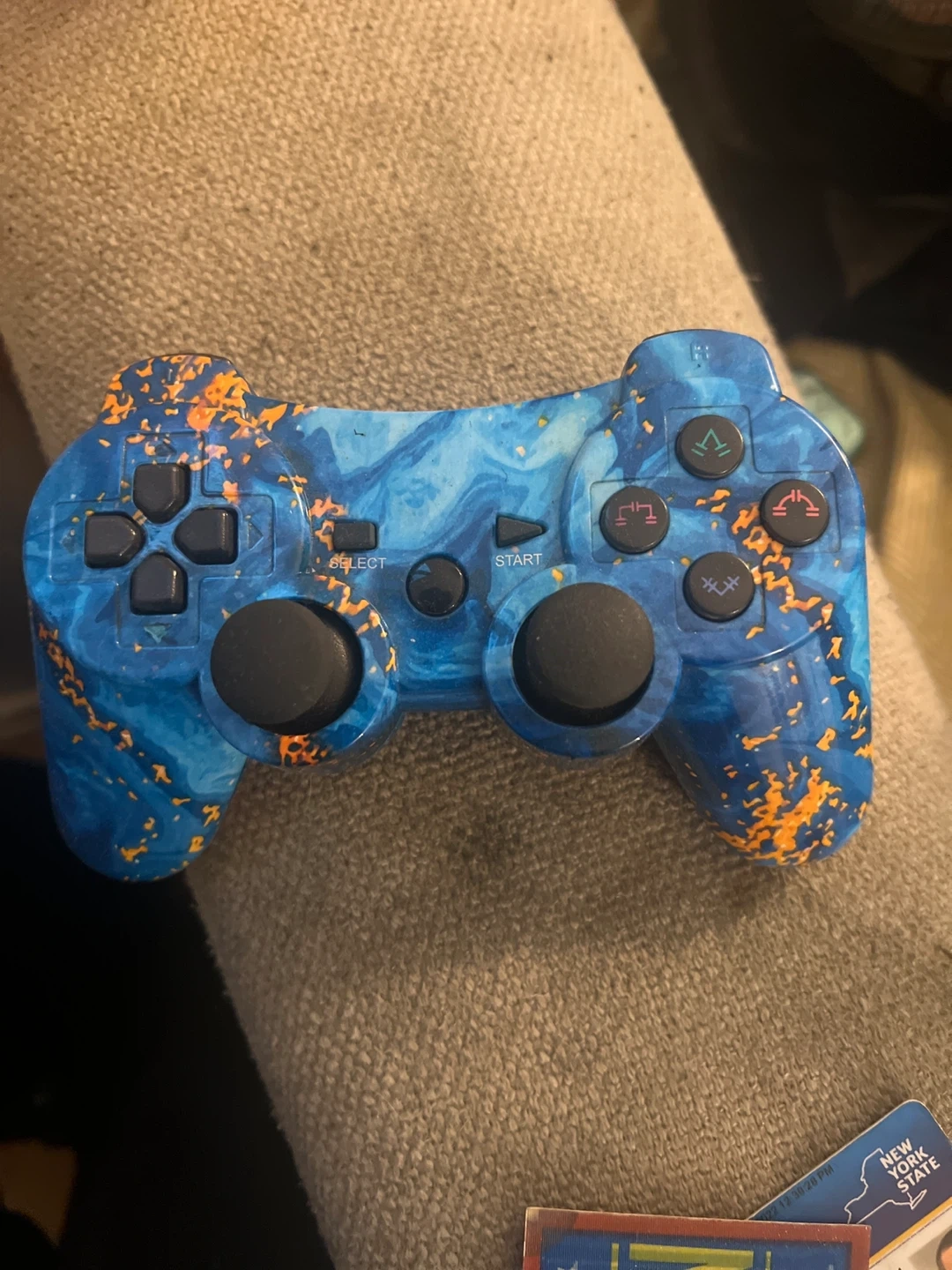 This is a custom-painted gaming controller with a blue and orange marble-like design. It includes all standard buttons and analog sticks for gaming. This controller is ready for your next gaming session!