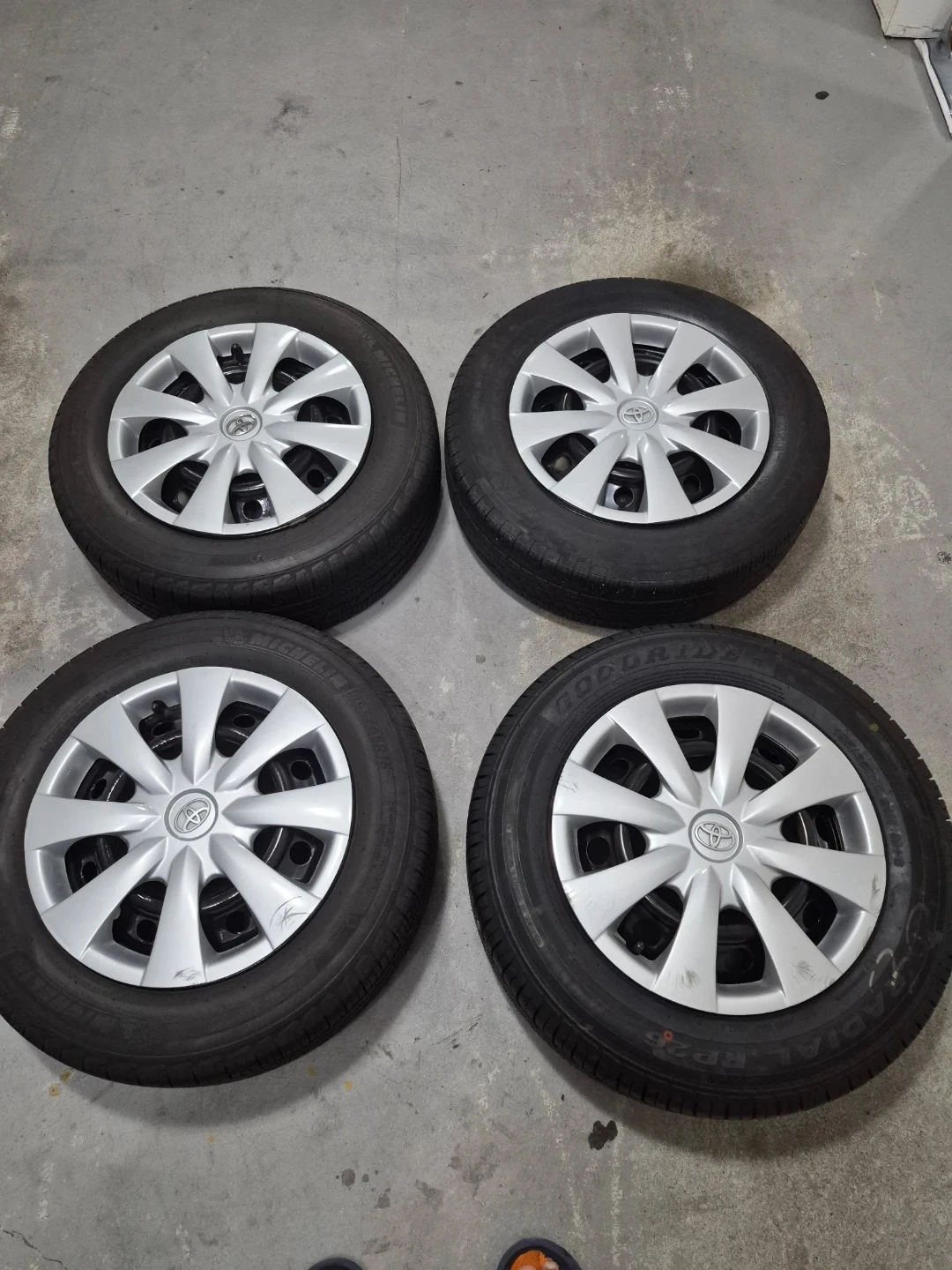 Four used Toyota hubcaps are available. These are the silver, 10-spoke style. They're designed to fit standard Toyota wheels. These would be great replacements for damaged or missing hubcaps.