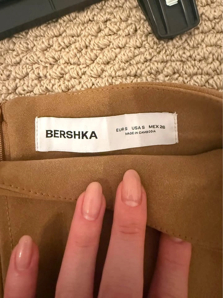 Bershka camel suede-look mini skirt in size S. Clean, structured fit with a smooth, soft finish and back zip closure. Perfect for fall/winter outfits—pairs great with sweaters, tights, and boots. Like new condition (5/5).