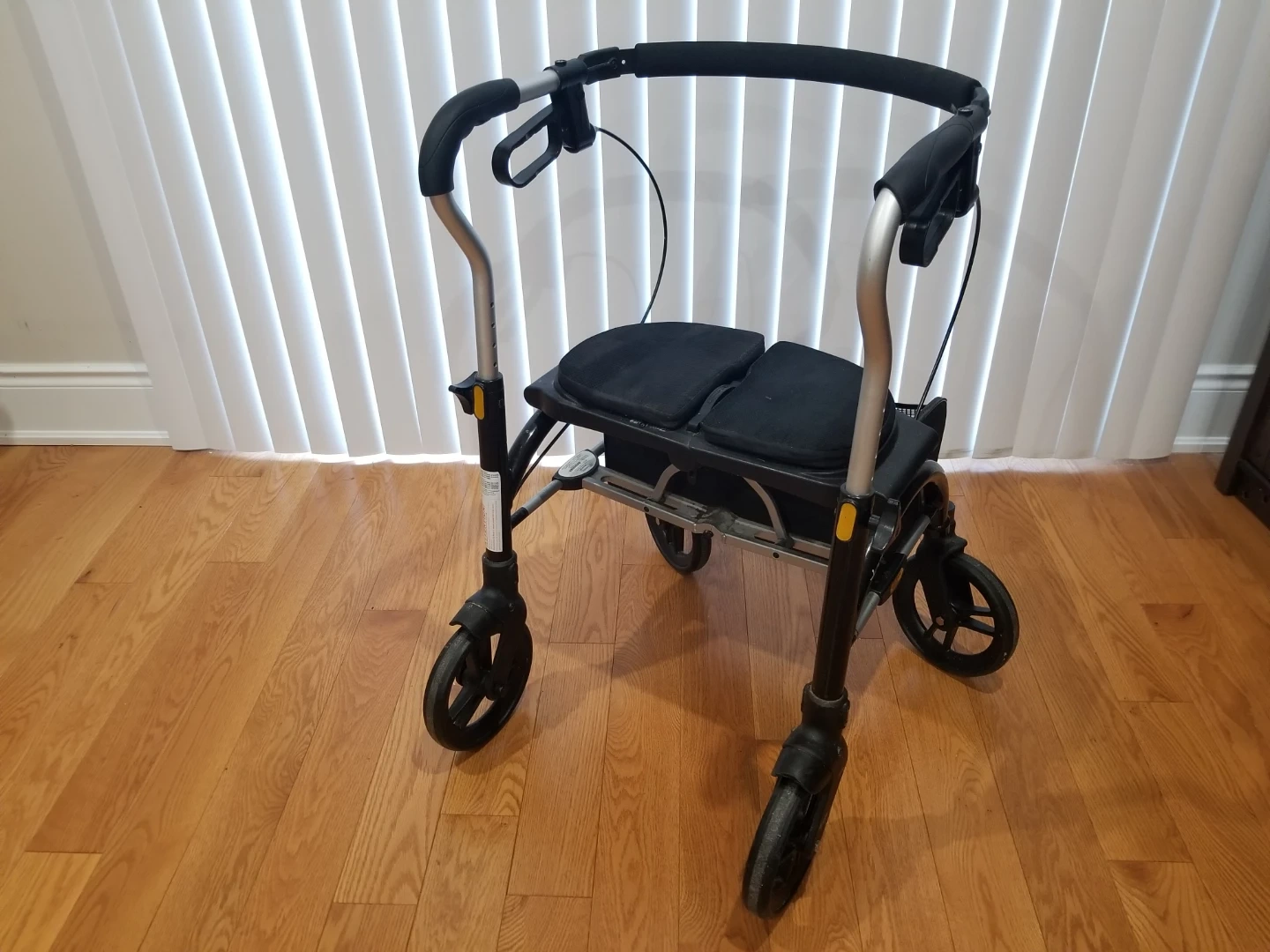 This rollator walker provides mobility support. It features a comfortable seat for resting. The handlebars are adjustable for personalized height. Foldable in good condition.